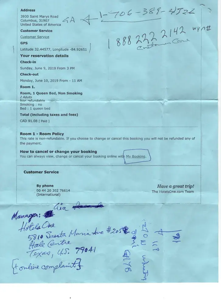 The online and paid booking was for a one night stay in Columbus, Ohio with booking # [protected]. When we arrived in Columbus Ohio the hotel could not be found and with help from locals, the Microtel destination was determined to be in Columbus Georgia. On the booking confirmation sheets, there were serious information omissions - namely, there was no reference to the State or a tel number of the property [so that a cancellation could be communicated]. I have talked to numerous associated agents to seek contact information - which you see on the attached jpegs of those confirmation sheets. The recent response through the HotelsOne agents was their policy for prepaid reservations is 'No Refund'. This issue is 100% worthy of a refund, as the Georgian property was paid but no service was provided and HotelsOne is totally at fault with its incomplete confirmation which created considerable frustration for two retired and loyal Microtel customers. Please do the right thing and return my Cdn $91.08 ASAP.