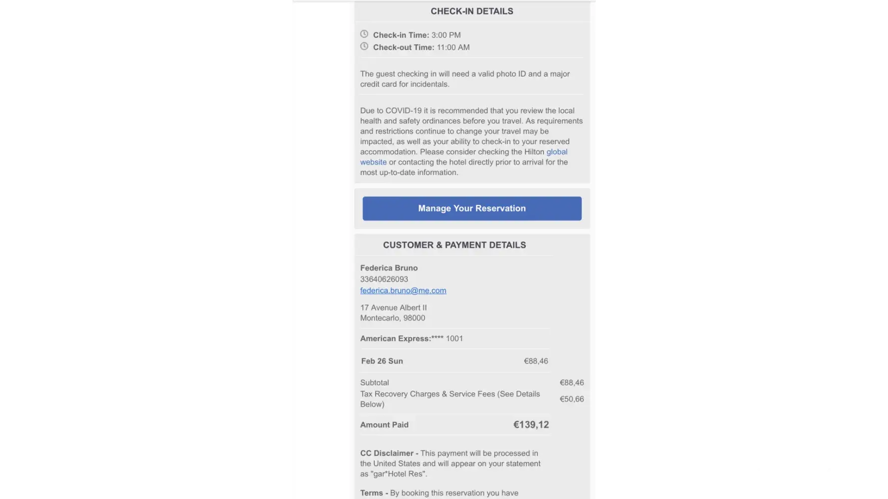 This payment will be processed in the United States and will appear on your statement as "cci*Hotel Res". A refund of US$144.36 has been processed and applied to your credit card. By booking this reservation, you have accepted the Terms and Conditions. Hotel Details