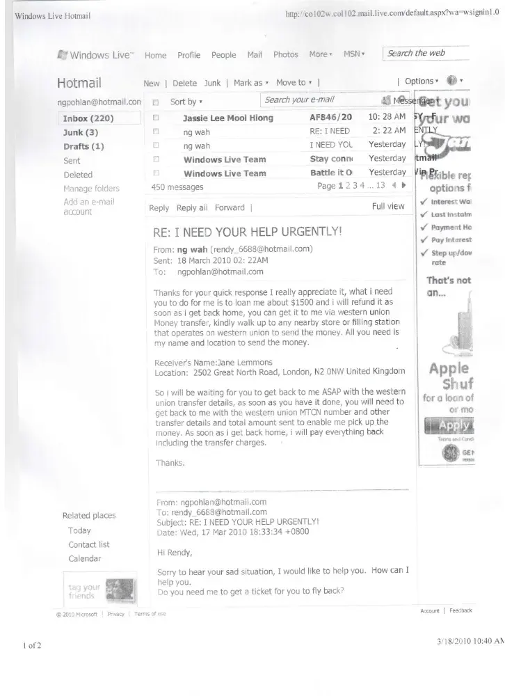 I recieved the e-mail below from hotmail on Monday. Unfortunately I responded to it, and this person got into my account and sent E-mails to all customers in my account scamming them for money on my behalf. Is there any way you can track them down from the e-mail they used an make them accountable for their terrible actions? I have very angry people contacting me thinking that it is ME trying to scam them for money. I look forward to a positive response from you.