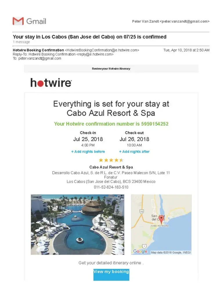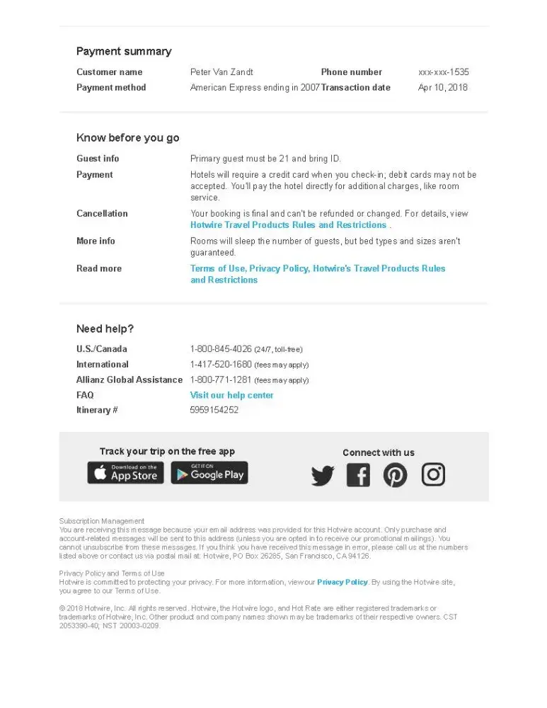 Hotwire Itinerary number [protected]; confirmation # 3975198