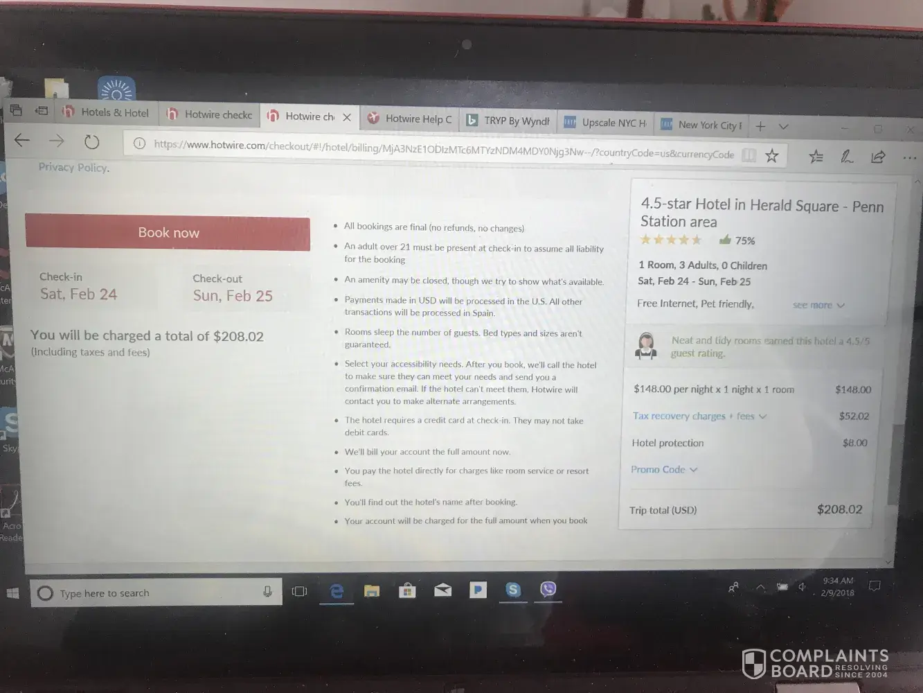 Did my hotel reservation and my original booking was 4.5 star penn station area . February 24-25th 3 people for $148 + taxes and fees $52.02 + insurance $8 total $208.02 . My confirmation # [protected] . But confirmation email sent me different charges for $ 216.74 as total . Tried to contact customer service and also sent screenshots to them, they did not resolve the issue. I made my booking for $208.02 and got charged for $216.74 .