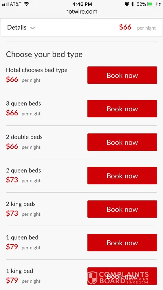I'm strongly concerned that the no refund or change policy for the buyer is not equal to the represented confirmed reservation that is given to the buyer. Fix the Hotwire site to match hotels available and the room types available. I would not have booked it if truly informed of option.