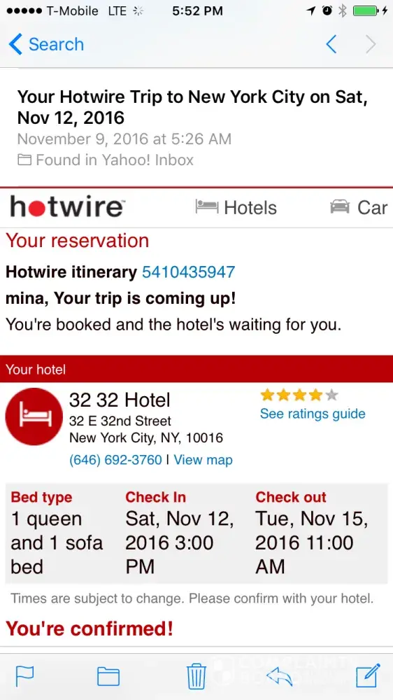 As soon as I received the itinerary I check out the hotels website and it was definitely not a 3 star hotel. There were disgusting pictures of dirty toilets, paint peeling, some phones were not working. Not a 3 star hotel. I called Hotwire back immediately asking for a refund and they said they couldn't help me because I agreed for a 3 star and I told the clerk yes I agreed to a 3 star hotel in New Orleans not an old, dirty outdated hotel. False advertisement. I have used Hotwire in the past but never again. False advertisement and I advise others stay away from Hotwire.