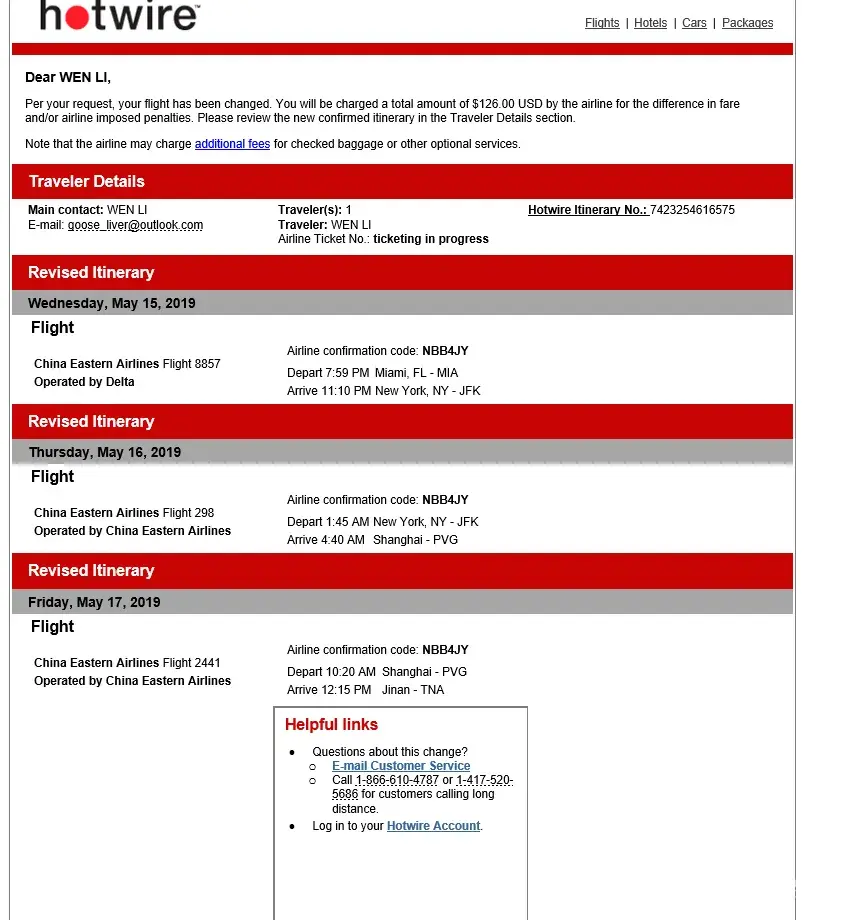 Your itinerary still remains as originally booked and we've made no changes to it. Also, there is no need for you to do anything on your end - we'll be working behind the scenes on your behalf to make this right. However, should you want to speak with us, please call us toll-free, at 1-866-468-9473 or message us through the Hotwire app (messaging is only available on iOS devices).
