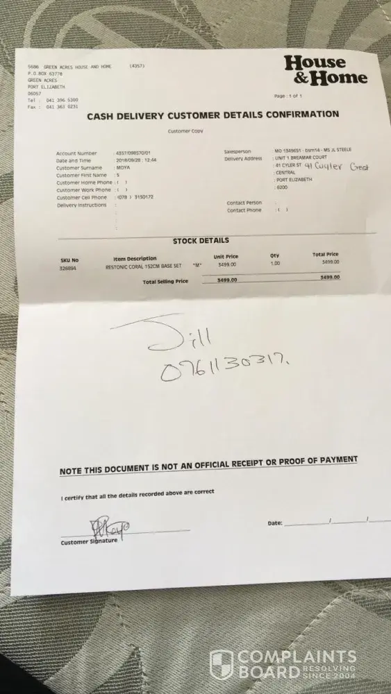 We are now sitting with two problems, no bed (do not know when it will be delivered, and if it will be delivered), second problem we have no receipt to get refund other than the delivery customer invoice (unless if we lie under oath and say we lost the receipt).