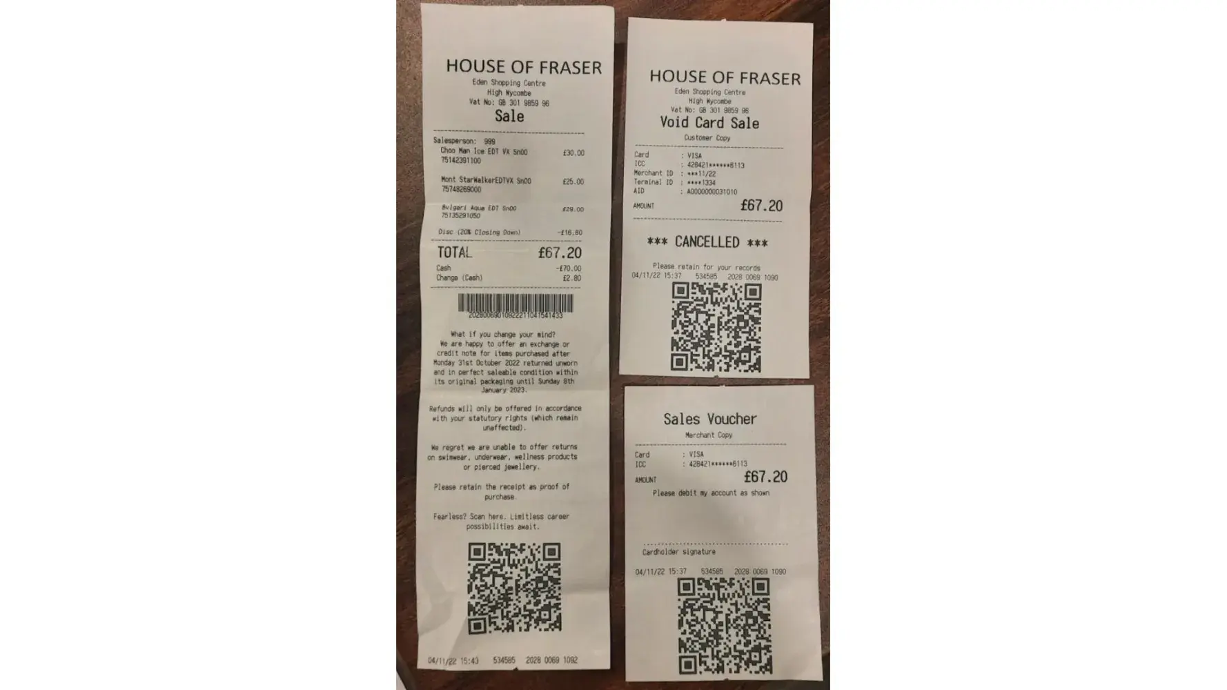 I live in Sri Lanka and was in the UK and on 4th Nov 2022 i purchased 3 Perfumes for the price of GBP 67.20 from your outlet at Eden Shopping Centre in High Wycombe. When paying the salesperson advised me that my payment has not gone through and that they do not accept signature cards, then i paid in cash, for which a receipt i have. However, on my return my credit card had also been charged for the same amount, which is not acceptable.