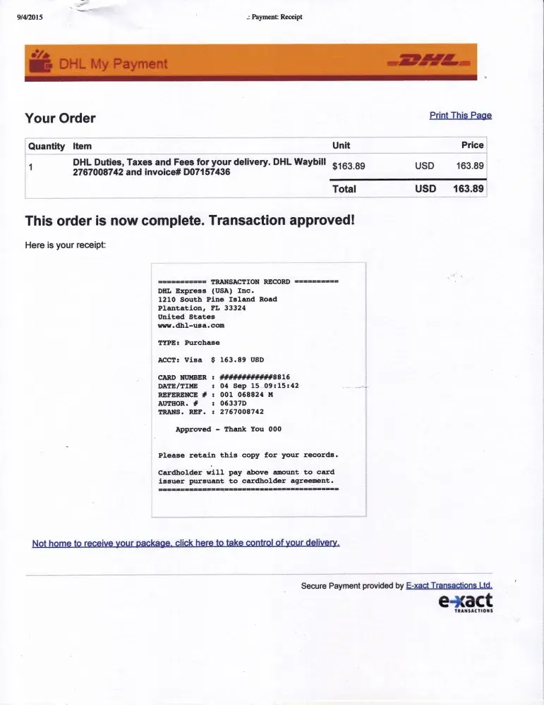 Customs/duty taxes: $163.89 USD.