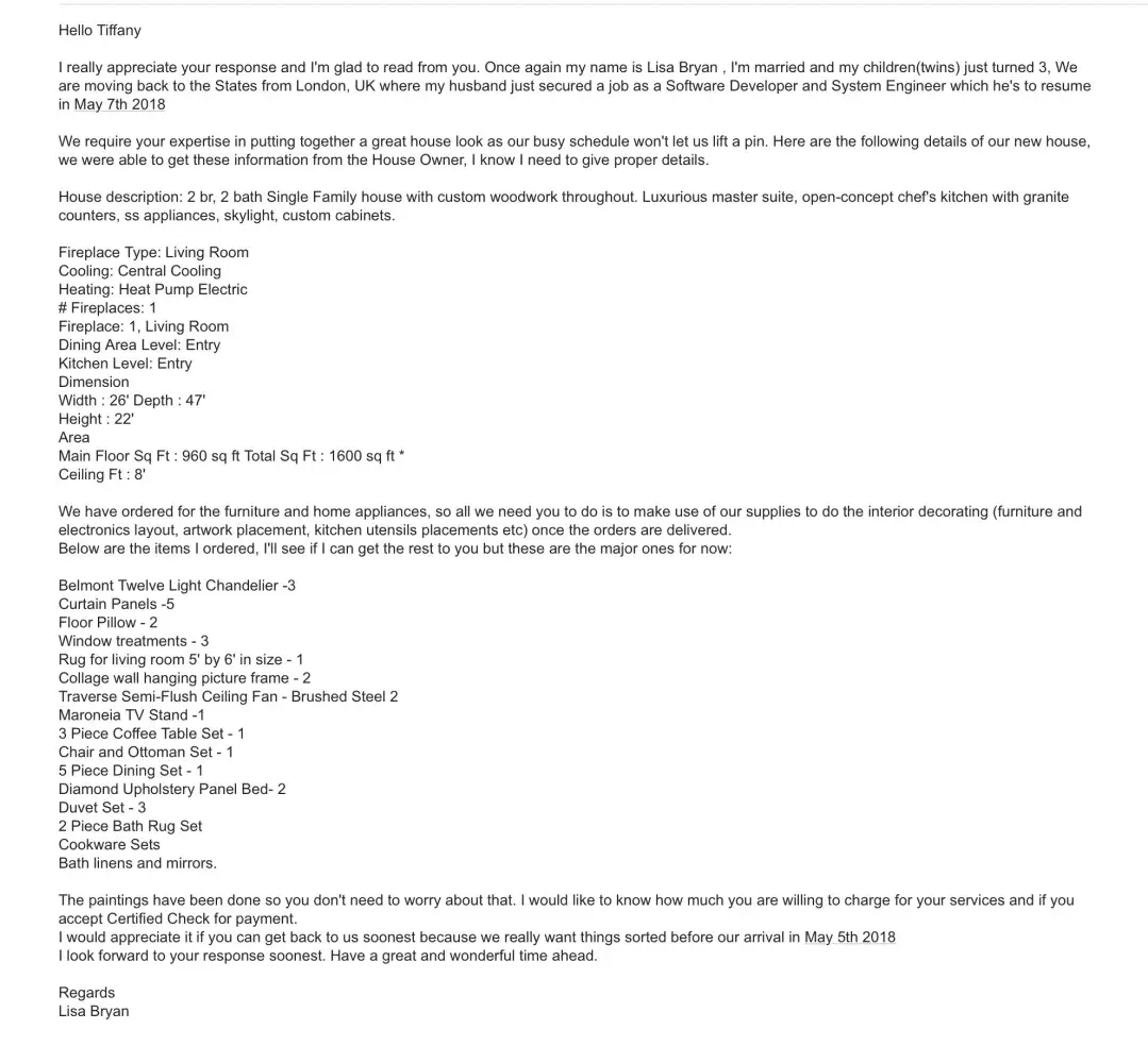 “Hi, I'm Mrs. Anita, I got your contact on houzz.com. Kindly email me at: anitaanderson955@gmail.com, I need an interior decorator to do installation and styling (staging) of items we have just ordered in our new apartment we are moving to next month. Thank you.”