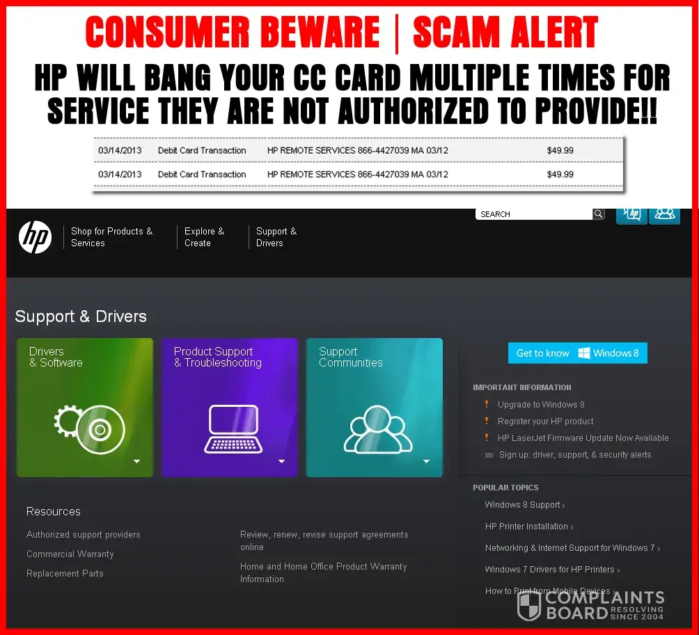 DO NOT CALL THESE ###! They take your credit card info and then POUND your card multiple times for fees they were NEVER authorized to charge even ONCE! When I called them about their bogus charges, they said they need 10 days to two weeks to due an internal investigation! No case # no info was given to me they just HUNG UP with me in mid sentence...this is a classic CC SLAM scam used buy long distance carriers back in the day when these scummy sales people would call and switch your service to their company without authorization...I knew better than to buy any HP product because of their terrible performance (printers)...but don't call their Service Dept. YOU WILL BE CHARGE FOR WORK YOU DON'T AUTHORIZE ON PRODUCTS THAT ARE STILL UNDER WARRANTY! These are the types of incidents that have so many people vilifying all BUSINESSES in our country...so it's important we single out and then steer clear of those Corp./Businesses that are truly unprofessional and unworthy of consumer support...HP is one of them! To the little HP punk who thinks he made a nice commission off me...I hope our call was truly recorded...because you should be out of a job!