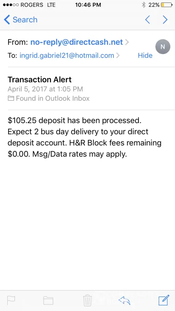Hi, for years I've been filing my with H&R Block, and never had any type of issues, but in march-April I decided to go get my taxes done as usual and, the girl that was helping me was new and didn't really know what she was doing or saying but I have her a chance, take in I had to pay 114$ to get my taxes done, she didn't even want me to cash a check she wanted me to get my refund put in my account which I later agreed, but then comes my gst refund day arrives and I have nothing in my account, I'm with TD, and they usually deposit by 305am, I received an email from [protected]@directcash.net, saying ; (106.75 deposit has been processed, expect 2 bus Day delivery to your direct deposit account, H&R fees remaining 0.00$. Msg/Data rates may apply.).. later that day I received the gst, now were July 5th and I still didn't get anything, got the same email, stating I will receive my $$ in two bus days, I never signed up for this, it's very rude and disrespectful that I have to wait an extra day or two for something that's supposed to be deposited at 3am, I would love to escalate this to higher level, it's unacceptable, and to think I recommended this company to friends and family, worst idea ever, I want this issue resolved quick, so this won't happen to my nxt gst payment, and I already know o July 10th I will not get my $$ on time, thank you for reading, I am waiting for your response..