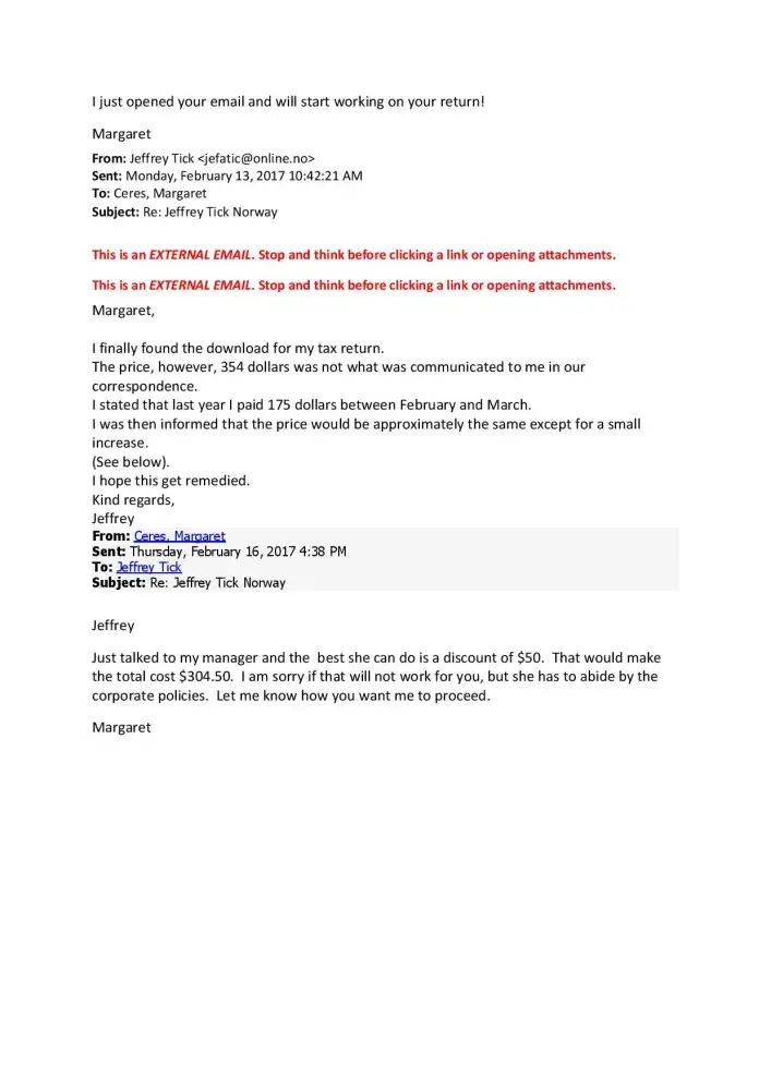 When I went to approve my tax return, the price was 350 dollars! I was informed that last year's price was a special. Of course I was aware of this but am also of the understanding that I asked for the same price.