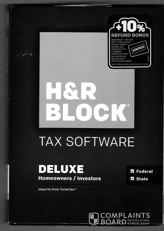 We purchased H&R Block Deluxe software CDs which says on box "+10% Refund Bonus. H&R Block will add 10% to the portion of your federal income tax refund put on a Staples eGiftCard when you purchase this product.â€