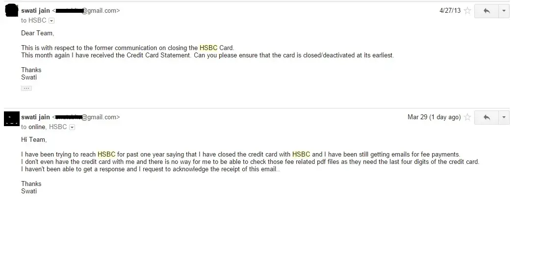 I have mailed grievance reddressal, [protected]@hsbc.co.in, [protected]@hsbc.co.in but havent received an acknowledgement from anyone. I still get credit card statements every month. If they ever send me a new card I never received it since I was not in the country so I am not sure whom did they deliver the card. I have attached one such communication which began in 2013