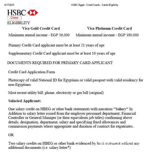 I am a salaried employee, my salary is deposited into my hsbc advance account in usd, 25 days ago I applied for a platinum visa credit card, but they advised me to apply for the advance mastercard, basically both eligibility are the same, I receive 3 times more than their minimum eligibility. to make a long story short, I applied the the mastercard one, and they told me within 10 working days I should receive it. well, after 3 weeks, I went to the bank to ask where is the card, I found that my application was declined by the bank while i'm a customer of this bank since 1997. and used many of their products, but lately the service is worsening, e. g. I received 4 different (opposite) sets of information regarding cards, and loans. no one cared to call me to tell me about the bank declination! no one directed me to other option, no one offered me any kind of assistance to address this issue, which was a total waste of time and trust. (ps: my annual income +400 k egp)