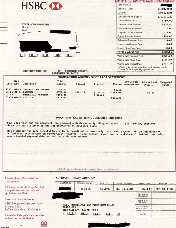 Original Principle Balance-$50, 343 at 8.5% over 360 months (30 years). So the loan was to be paid off in 2022, they also collect escrow for taxes and insurance. All payments from beginning have been made via ACH automatic payments first missed payment was June 2011. In 1998 my father began making extra $100 monthly principle payments and the balance is still $16, 000. If I am correct the mortgage should have been paid off between 2007 and 2010. For an example the statement for 01/20/2004 has $281.79 going to interest and $105.30 going to the principle with the extra payment $205.30 going to the principle.? By this time we had been in the home almost 12 years and paying extra principle payments of $100/month for close to 6 years. We we just notified that HSBC transferred the mortgage to HSBC Bank which it plans on closing in NYS. There is a second loan with HFC all of the information provided regarding the loan is false, age, employment, income, phone number, credit life-The credit life is actually how I started looking into the mortgages, they inflated the income and decreased my fathers age amongst other things to force sell joint credit life and the approval of the loan. They collected a few payments for credit in an amount other than the one disclosed in the provided closing documents and just stopped for no reason. They said they stopped for non payment but as required they did not notify us in writing and I made the payment myself in the amount of $1, 400 and it left a surplus of unapplied funds over $200; they were collecting $26.74/month for the joint policy. HFC and HSBC have not responded to our detailed QWR outlining our issues and the information needed to resolve such. There is also a third loan serviced by CitiFinancial that is in dispute. They collected ACH payments on my parents joint account for 3 months after my mother passed and have yet to return the funds although the debt is in my mothers name alone and my parents aren't married and my father has no legal obligation to pay the debt. Also writing did provide some information requested in the QWR and I noticed it said my mother was like 81 years old my mother was born 09/11/1958, they also stated that they gave my father the right to cancel as his "signature" appears on the notice but it doesn't look like his hand writing and why have him sign a right to cancel as it was her sole debt, they stated that they gave a check for over $1900 she did not receive, they added over $1900 onto the principle for insurance options which the documents provided shows that declined and was not aware of the purchase, the date provided on the right to cancel as the signing date for my father is the same date that funds were dispersed to my mothers creditors and my father did not benefit from the funds. Truthfully, the information is so messed up that I'm not sure who originated these loans, before the loan is closed you are required to show identification and income, there is a form in citifinacial records that stated they ran a credit check but I'm not sure they did because the information provided was so wrong, and there is another woman with the same name in Rochester, NY. I used to go to St. Andrews catholic school with her daughter and for awhile I had to eat cold lunches because they mixed my mothers account up with hers and my mother paid for my lunch in advance so that I could eat hot lunch it was included in the tuition cost and the other child was packed her lunch. The school reimbursed my mother and apologized. Citifinancial also sent us a letter stating that our loans will be serviced by another provider beginning the 30th of June 2011. The organizations that are here to help seem to be working against us. They told us to forget pursuing the wrong that was done and just continue to pay or let the house go and move on. I truly believe that something fishy is going on in NYS and it has something to do with Monroe County and NYS Politics. I have the HUD state ment that shows irregularities when compared against the loan offer made by the lender. My parents paid over several hundred thousand, and HSBC sets the mortgage back about every 4 years, that sounds like Yield Spread Kickbacks. They are also applying less than the $100/month and I was told by an organization that was designed to help fight predatory lending and to let the house go, because my dad and I couldn't afford it. There's a reason why we can't afford it; they Monroe County and NYS polititions who are getting rich of our misery by allowing these ### to operate and probably own some of those HSBC accounts that weren't disclosed when the IRS went to the DOJ for that John Doe warrant, but I got some names and law firms for you found right on the HUD 1A, one of the law firms specializes in wealth preservation, when someone dies and has allot of debt they help the estate with the mortgages?. For a second opinion I got a free consultation provided the attorney with the same documents and info and he said my father owns the house free and clear and should pursue legal action against the lenders.