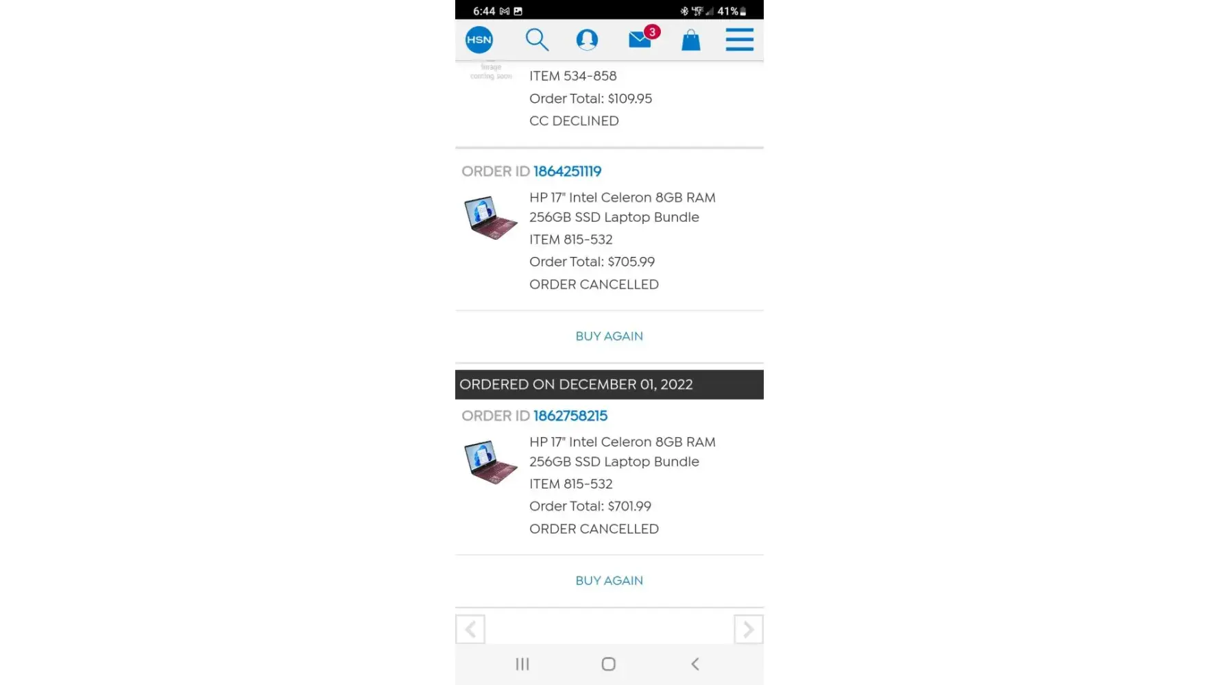 I have tried to order the same item HP laptop 5 different times 4 different ways and for some reason it keeps getting canceled. The 1st time it was said that they could not verify who I was. I got intouch with the Fraud department and provided the information to prove who I am. Waited 3days for my HSN credit card to post the credit back. Tried to order again, this time it was canceled saying I wasn't eligible for flex pay but mind you they gave an HSN credit card. The third time I tried to order and paid for it straight out, the order got canceled stating that I need to verify myself. I called the Fraud department again to proved who I was again (3rd time) Now mind you I ordered a cheap underwear set and there was no problem with me receiving that order nor did I have to prove who I was. I tried ordering the Laptop a 4th time and it was canceled a 4th time for the stating cannot prove my address is legit. If you can't prove the address provided is legit, how in the world did I receive the cheap underwear set no problem. It's the same address and I am the same person without having to prove who I am and receive those with no problem. Needless to say, I will not be ordering from HSN again. I don't want this to happen to anyone else.