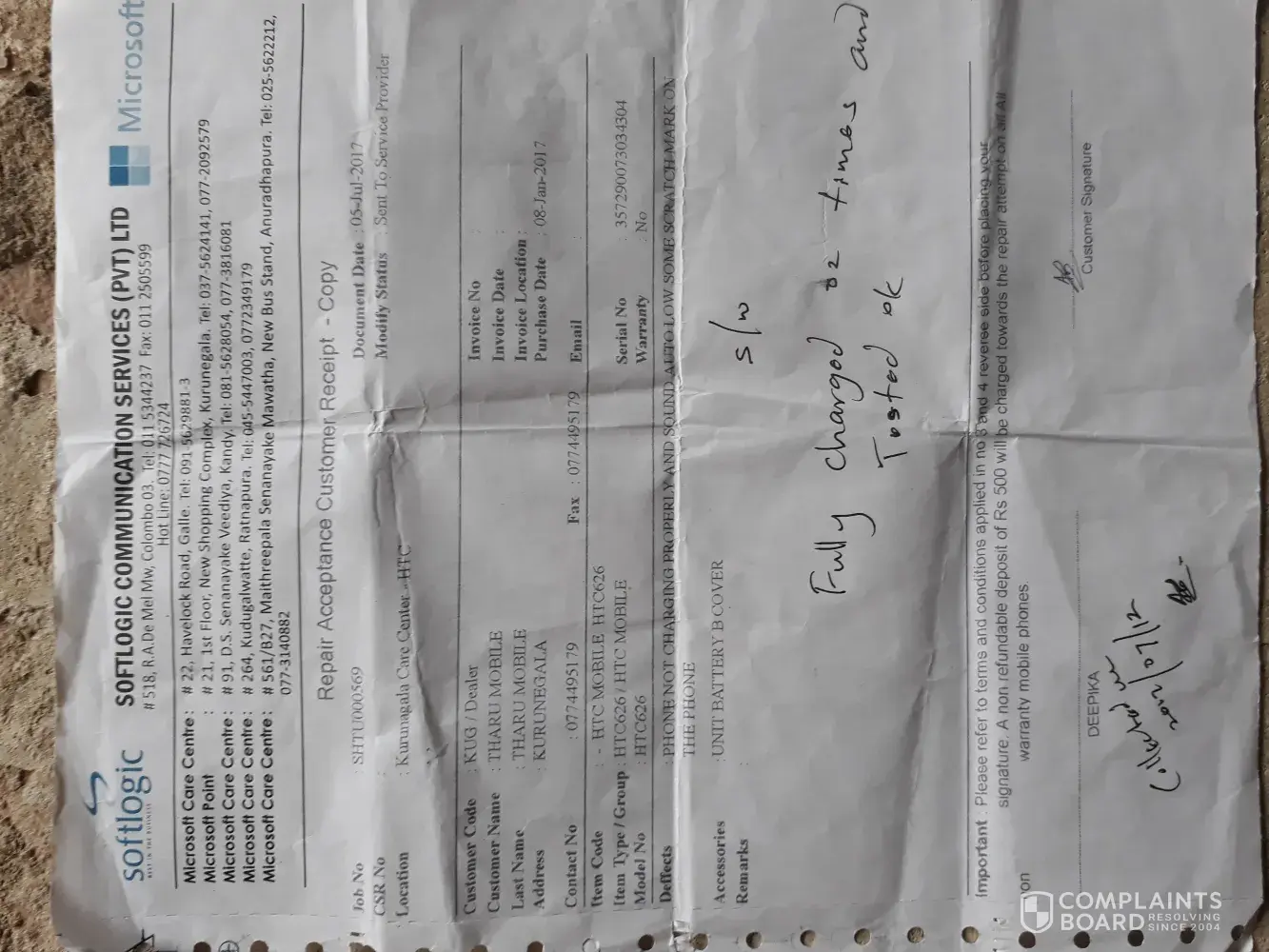 HTC 626 (IMEI [protected]) portable mobile phone, I brought from Softlogic company of Sri Lanka in 08-01-2017 year with one year warranty. This company is an agent of Sri Lanka. Dear sir within 6 month after bought this portable mobile phone gave me wrong sound problem . Then I gave it to dealer of Sri Lankan for repairing . After repairing (change software ) they return to me.