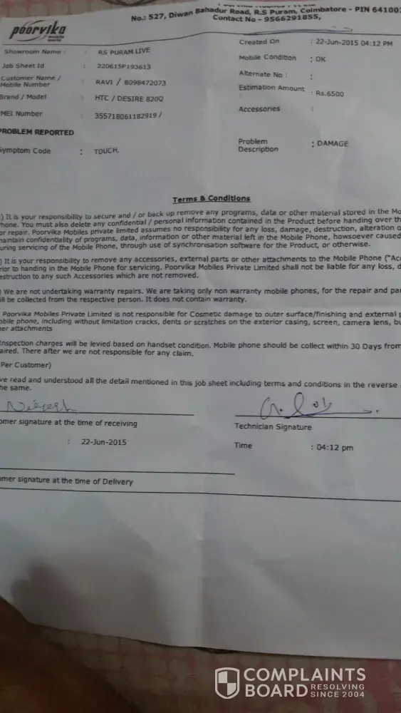 From R. RAVI No.100, Karunanidhi Nagar Sungam Ramanathapuram Coimbatore – 641045. Mob: [protected]. E-mail: [protected]@gmail.com To HTC Centre Bangalore. Dear Sir, Sub: HTC Desire 820q handset replacement regarding. Ref: (1). My earlier complaint letter dated 10.8.2015, 28.8.2015, 2.9.2015, 2.9.2015 & 9.4.2015. (2). Your reference dated :28.8.2015, 2.9.2015, 8.9.2015, 9.9.2015, 10.9.2015. ******** I wish to bring your kind attention again on the same matter regarding the replacement of handset due to consistent repairing. My hand set model no: HTC Desire 820q & IMEI NO: 355718061182919I and purchased on 21.1.2015 from M/S. Poorvika Mobiles Pvt. Ltd, Brookefield, Coimbatore for Rs.21, 500/- under WARRANTY. This is in continuation to the last service I had on 14.11.2015, till date the following problem persists: 1. For some applications, the screen scrolling feature is not working. 2. Multiple characters are displayed for single press like ‘aa’ for sinlge press of á’ 3. Hanging off and automatic switch off. For the last one year I have been given 7 times to repair within the warranty period. But, not even on a single occasion the service was done to my satisfaction and I never satisfied with the performance of the device. Before servicing, it was functioning well. But, after the frequent service, it has not been rectified properly. Hence, I strongly believe that there is some manufacturing defects which I cannot tolerate any more. Hence, I request you to replace the device with a new one. Your immediate attention will be very much appreciated. Thanking You, Yours faithfully, Date: 02.12.2015 Place: Coimbatore. ( R. RAVI)