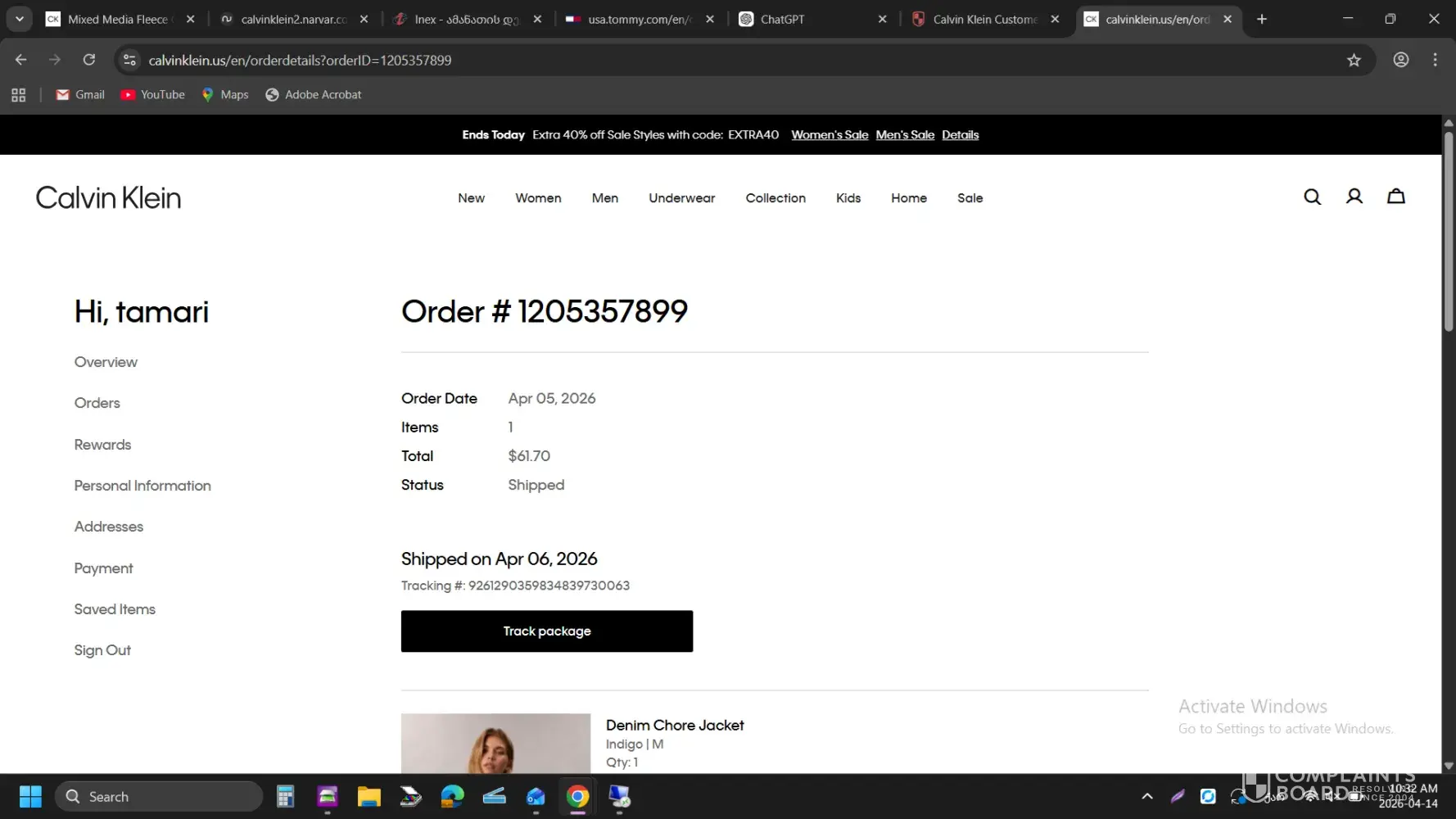 I purchased a denim jacket from your website (https://www.calvinklein.us/en). My order number is Order #1205357899.