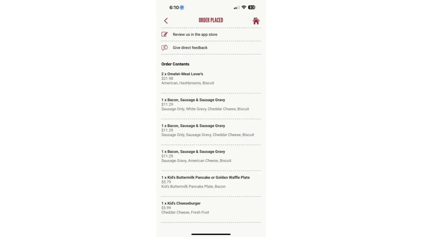 So on the morning of August 11th 2023 I ordered 2 biscuits & gravy w/ a side order of 2 sausage patties on the Huddle House app. It was the same order I had placed on the 1st of August. In my first attempt at using the app I had absolutely no issues. However, it was a completely different experience. I had issues ordering. Couldn't quickly find the menu...