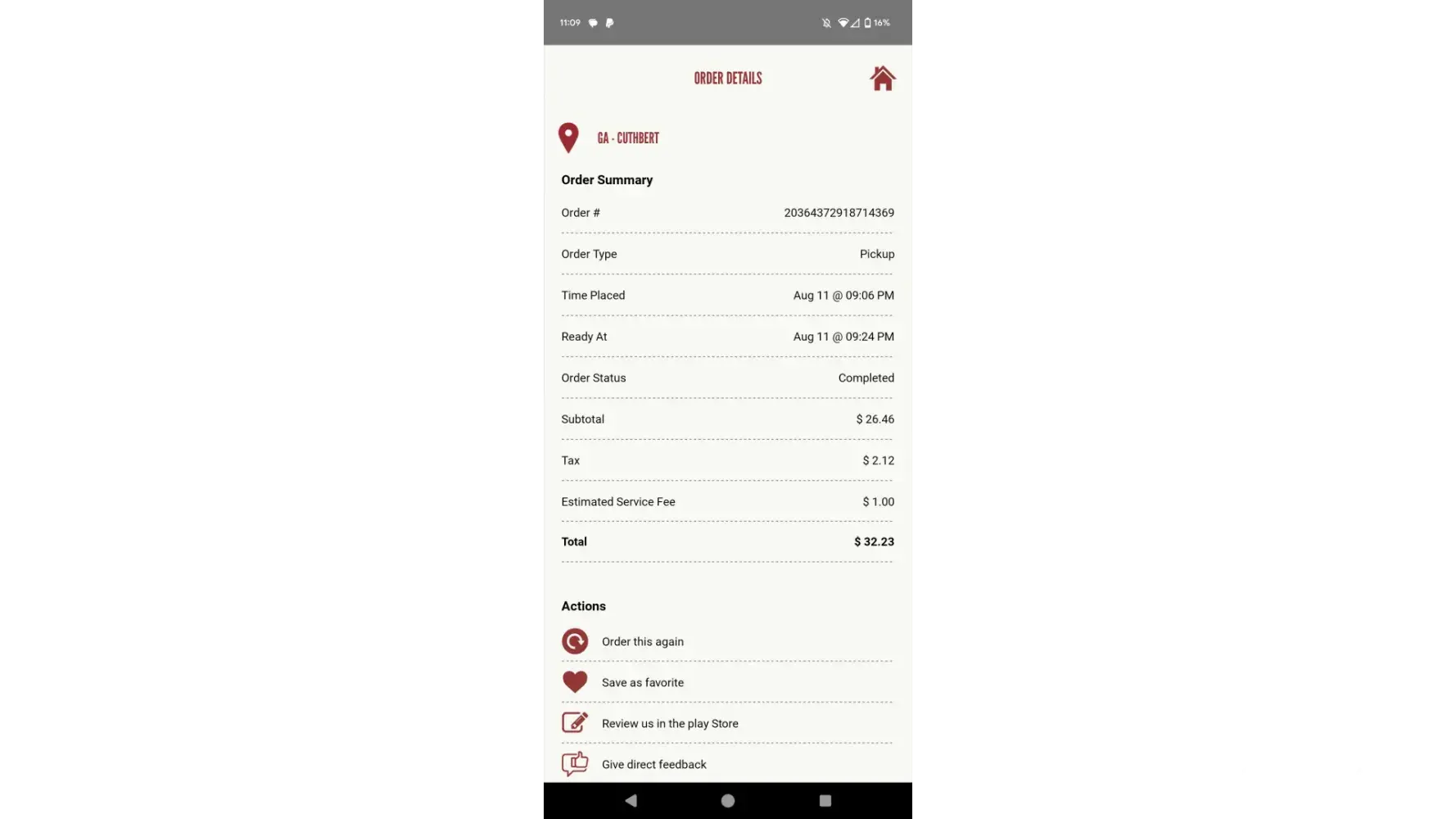 I have the huddle house app downloaded on my phone. I placed an order through the app with my local huddle house (Cuthbert GA), they accepted my payment and told me my order was being prepared. They were not even opened, and of course, I never received my food. They wrongfully charged my debit card for $32. This happened on 8/11/2023 from 9:06 PM-9:24PM