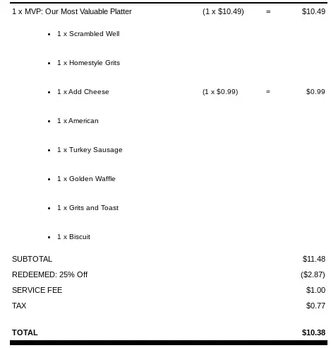 I ordered over the phone four meals I ordered two mvp breakfasts we didn't get one of the waffles and the bacon was burned and melted the plates completely also both and the hasbrowns were so hard that they we unedible, and we didn't even receive one of the meals the two eggs and bacon. The philly sandwich the bread was burned we couldn't even eat it. I have the receipt and the food was cold. Also the gravy was spilled out of the plates and all over everything. We received no utensils nor any syrup.