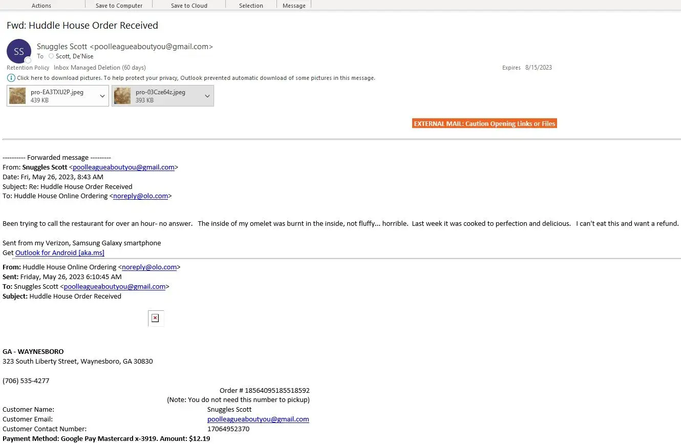 The huddle house on hwy 16 in jackson ga is a nightmare.. Never any good service and u barely get the food if u do.. Any online order is never ready under 2 hours.. I would like a refund.. Online ordering is paid upfront and should be done immediately.. Other orders after the online order shouldn’t be made until after the online order is completed…I have been late to work and lost countless orders at that huddle house.. I would like to get a refund for my purchase I didn’t receive…[protected] can someone please contact me regarding my refund