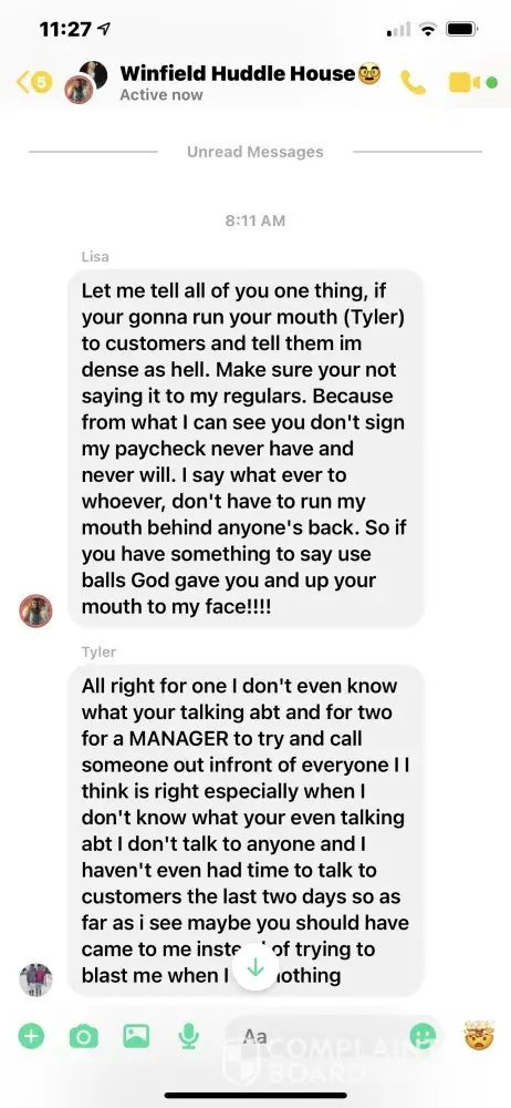 The store is never open and the manager is outrageous towards employees Lisa. The store manager stays clocked in and is never there and everyone there is on on drugs and has went downhill they are stealing the store blind below is examples of how management treats the employees calling them out on group chat