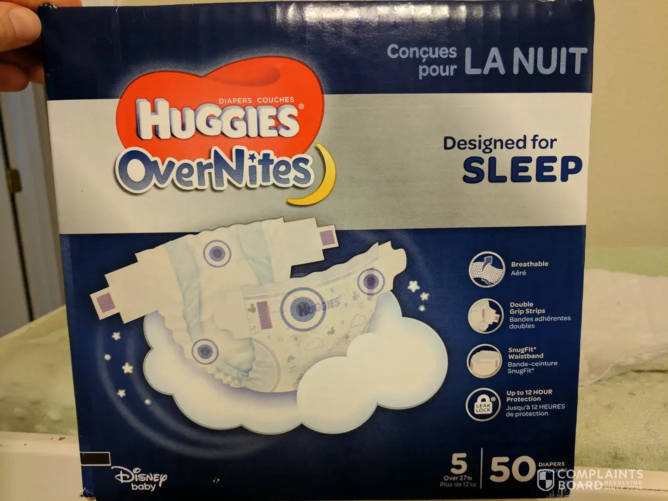 [protected] 5 and also in the front is says it has triple layer protection to help stop leaks. And they have Mickey Mouse character on them as well. I really hope this helps and you can gets this fixed this is very concerning as a parent. This is not the first time we have had problems with huggies. Our daughter is 7 months old and when we buy huggies and lay her down and she will wake up in the middle of the night drenched in pee because the diapers aren't lasting long at all. They don't have the "12" hour protection like it says we lay her down and she is up in three hours soaked in pee we just haven't been happy. We love the way they fit just wish they would last longer at night and like I said the gel is a little concerning.