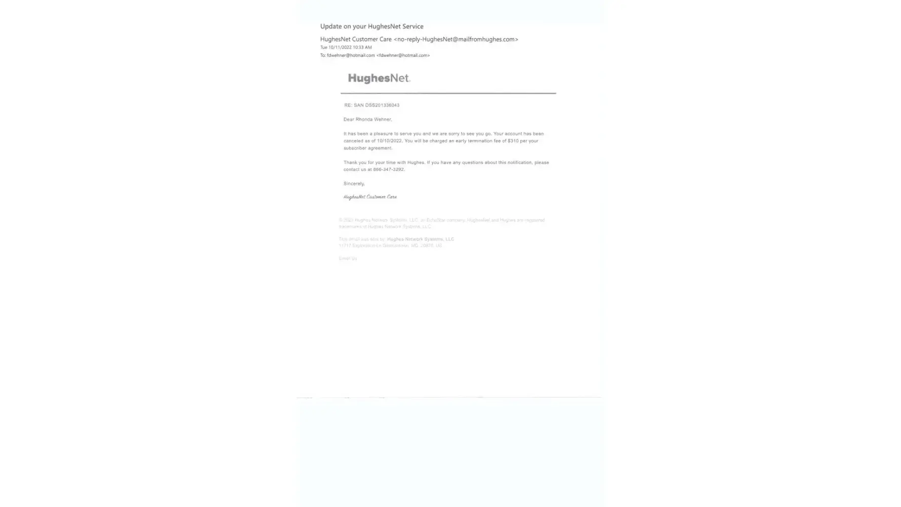 It has been a pleasure to serve you and we are sorry to see you go. Your account has been canceled as of 08/28/2022. As per your subscriber agreement, you are not responsible for any early termination fees. However, leased Hughes equipment will need to be returned. If you would like HughesNet in the future, you will need to sign up as a new customer.