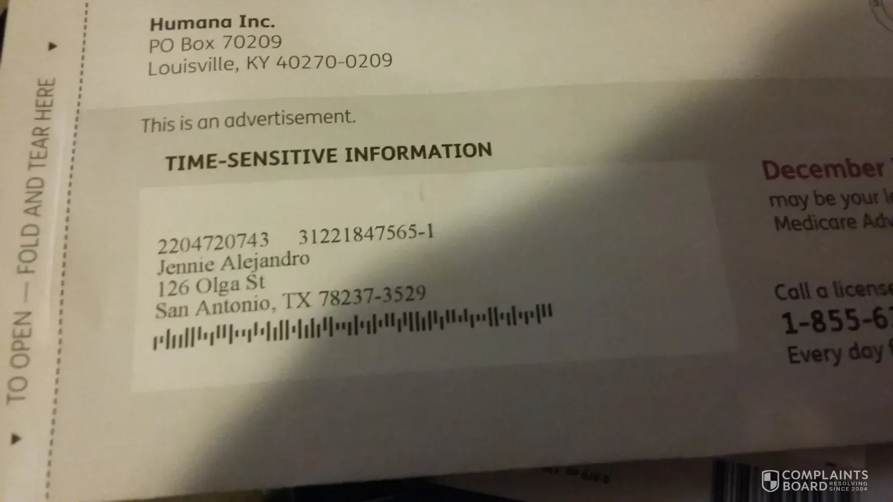I have returned alot of mail back to sender Humana p.o. box 70209 Louisville Ky 40270 for Person named Jennie Alejandro at 126 olga San Antonio, Texas 78237. I have stated and hopefully will be the last time. No one by this name lives here . My name is Robert Sandoval resident for over 60 years at 126 olga. Never has a person lived here by the name Jennie Alejandro. PLEASE, correct your records and remove this person at this address, so that we no longer will receive her mail. I have contacted the Atty. General in San Antonio, asked me to keep record of how many pieces i receive. This needs to stop now. Again STOP sending any correspondent for Jennie Alejandro to 126 olga dr. San Antonio Texas 78237 no one lives her with that name. STOP STOP STOP. My name is Robert Sandoval / [protected]@yahoo.com