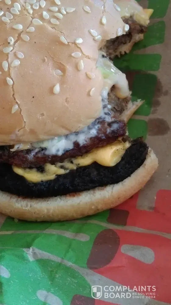 I purchased a double whopper with cheese meal, the bottom patty was burnt and inedible (photo attached) also the onion rings looked and tasted hours old, this was after I requested a fresh order of onion rings as the first lot looked even worse, this "fresh" batch took less than 30 seconds to be produced, I suspect they were just re-dipped in the oil, these also were thrown away. A very disappointing meal and for almost $20 I expected a much better experience