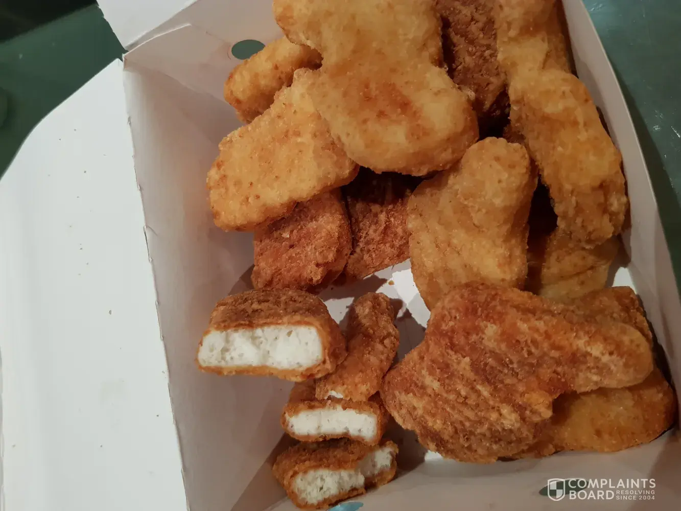 I bought 18 pieces of nuggets, only 3 were normal, others were rotten, super dry texture and tasted sour. It is also very hard...It is very obvious from the picture, the colour of the nuggets are extremely brown compared to the normal ones. It seems like it has been kept for a few days and was refry for many times. This isn't the first time I experienced this, please do something about the new Elizabeth st store and compensate