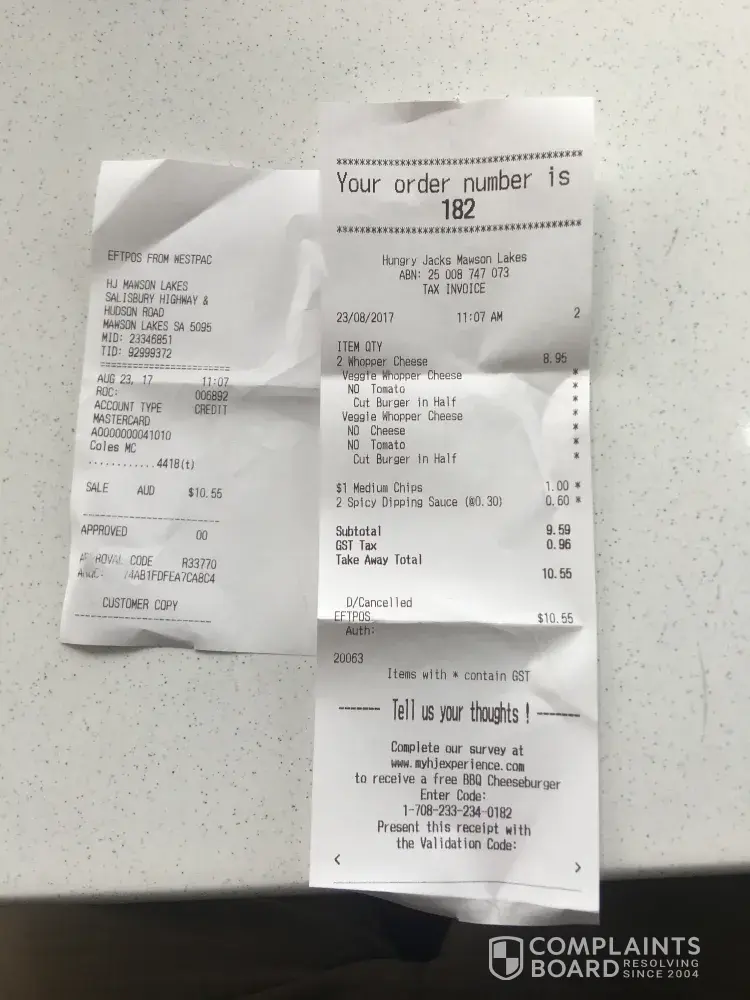 Disgusted with what I considered to be almost a bad taste joke, we called the store to complaint seven (7) times, each time ringing until the calls timed out except for the last call to which someone at the store picked up the handset to avoid the ringing but left the unit on the bench as we could hear what was going on at the store but no one talked to us. In summary, the whole experience was deplorable and truly tarnish the Company's slogan of "the burgers are better at Hungry Jack's".
