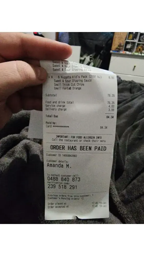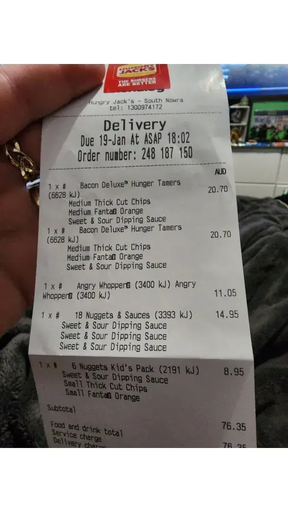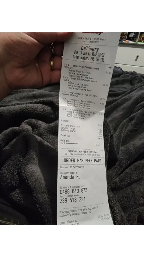 Rang the store who said it’s not our issue contact menulog. I explained I ordered through the Hungry Jacks app not menulog. The Manager told me they don’t get the money so can’t process a refund and it has nothing to do with them. I expressed how angry I was and she said she would ring menulog and get them to contact me…..