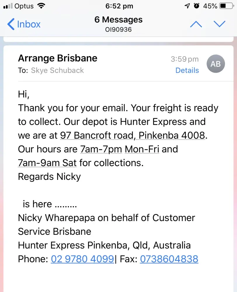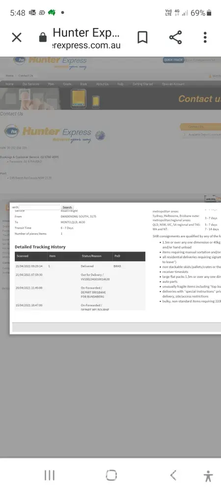 This business can not be contacted. I had to formally complain in order to get me item delivered it was 10 days late. It finally arrived. The driver threw it over our fence. The box was held together with tap. Every part of the box was either indented or had massive rips and tears. This company is the worst courier company in the country and all vendors and purchases should be aware and not send or receive anything from them. The only way you get a response is to give them a bad review on the website ‘product review'. They get no less than 20 complaints on there a day.