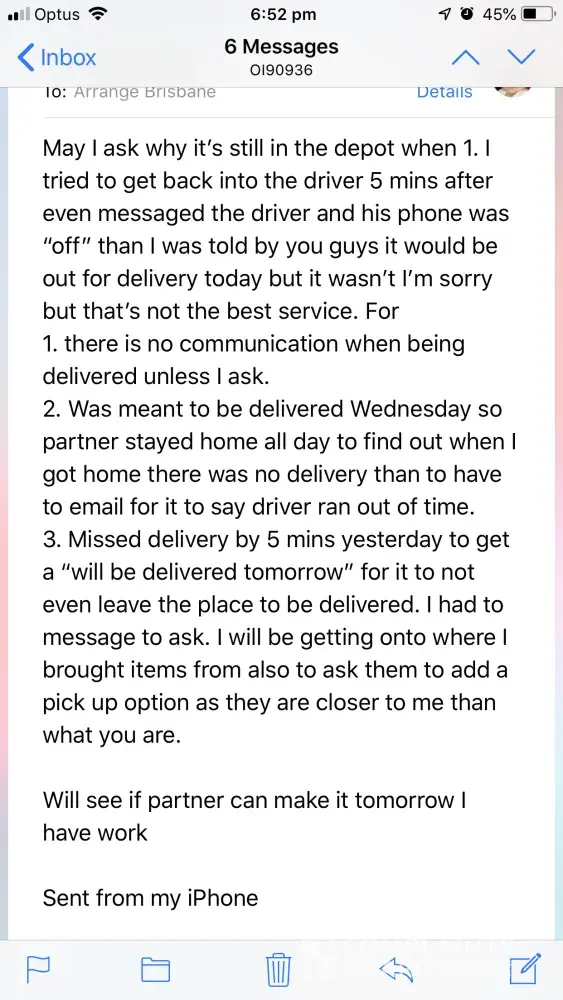 At 2:47pm the tracking was updated to ‘returned to depot'. I rung again and spoke to Jeremy who advised me that the driver was inundated and would not be able to deliver again. At this point I was furious and asked to speak to a manger but he said no one was available, mind you he didn't even ask! I then proceeded to call the Melbourne depot where I spoke to Jenny. She was lovely and followed up with the driver who then advised that he would deliver it that evening. This did not happen! It is Good Friday today and after 2 days of waiting for a delivery which never came I am livid.