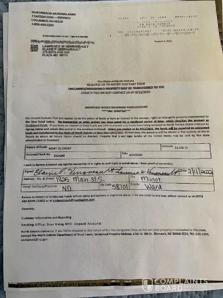 We received a notice of unclaimed funds regarding our past mortgage with your bank. We filled out the form from your company and sent copies of our current drivers licenses from North Dakota for proof of identity and have nothing but a run around about the check ever since, when we call to inquire!