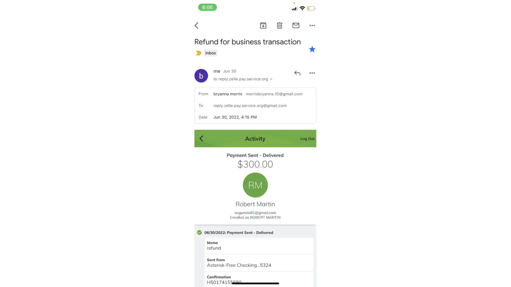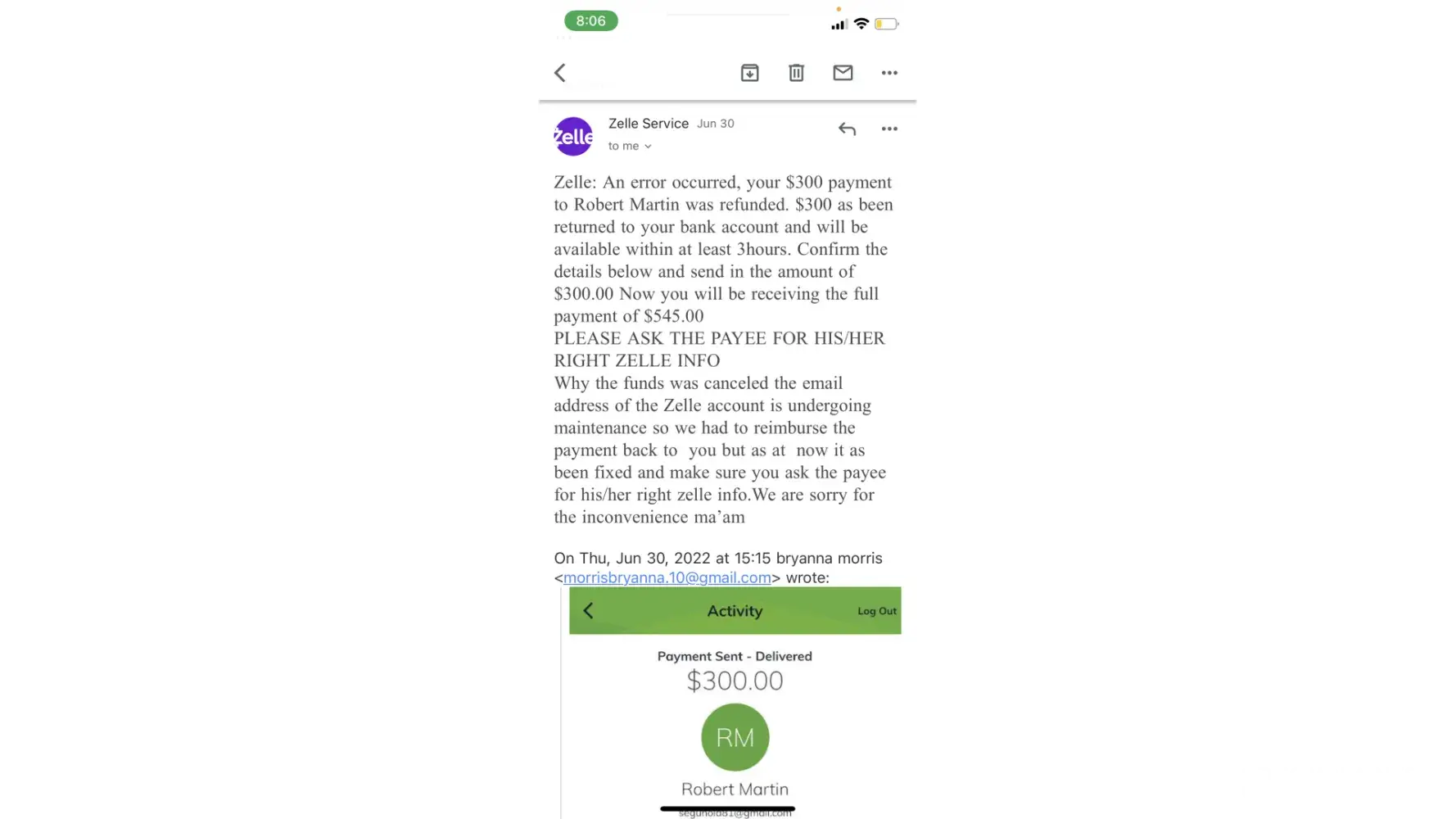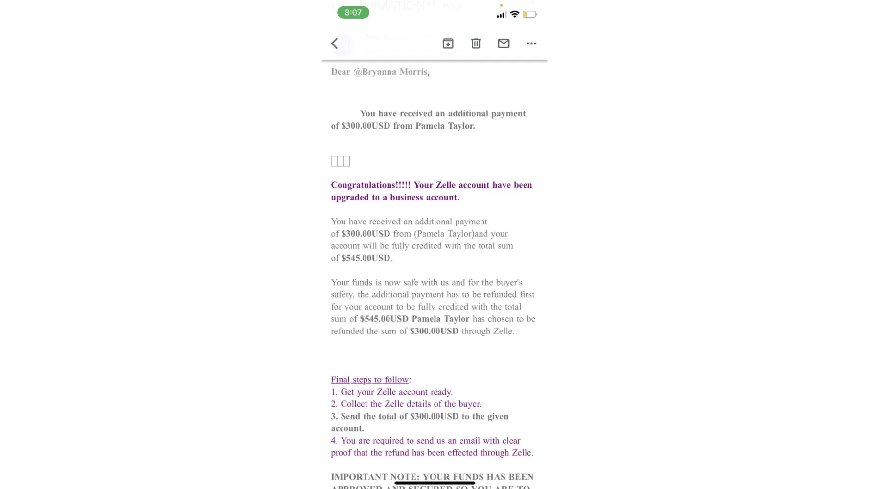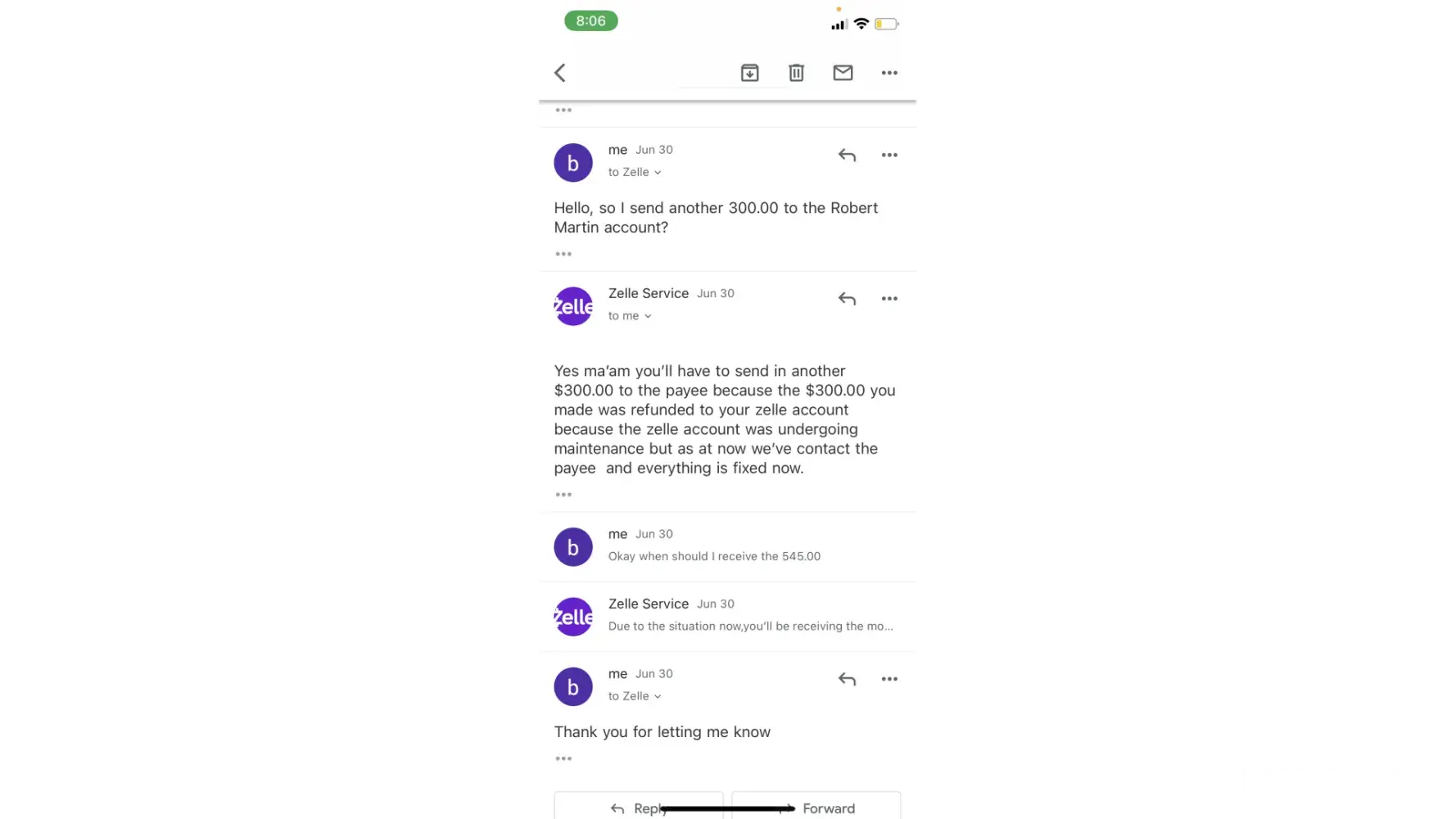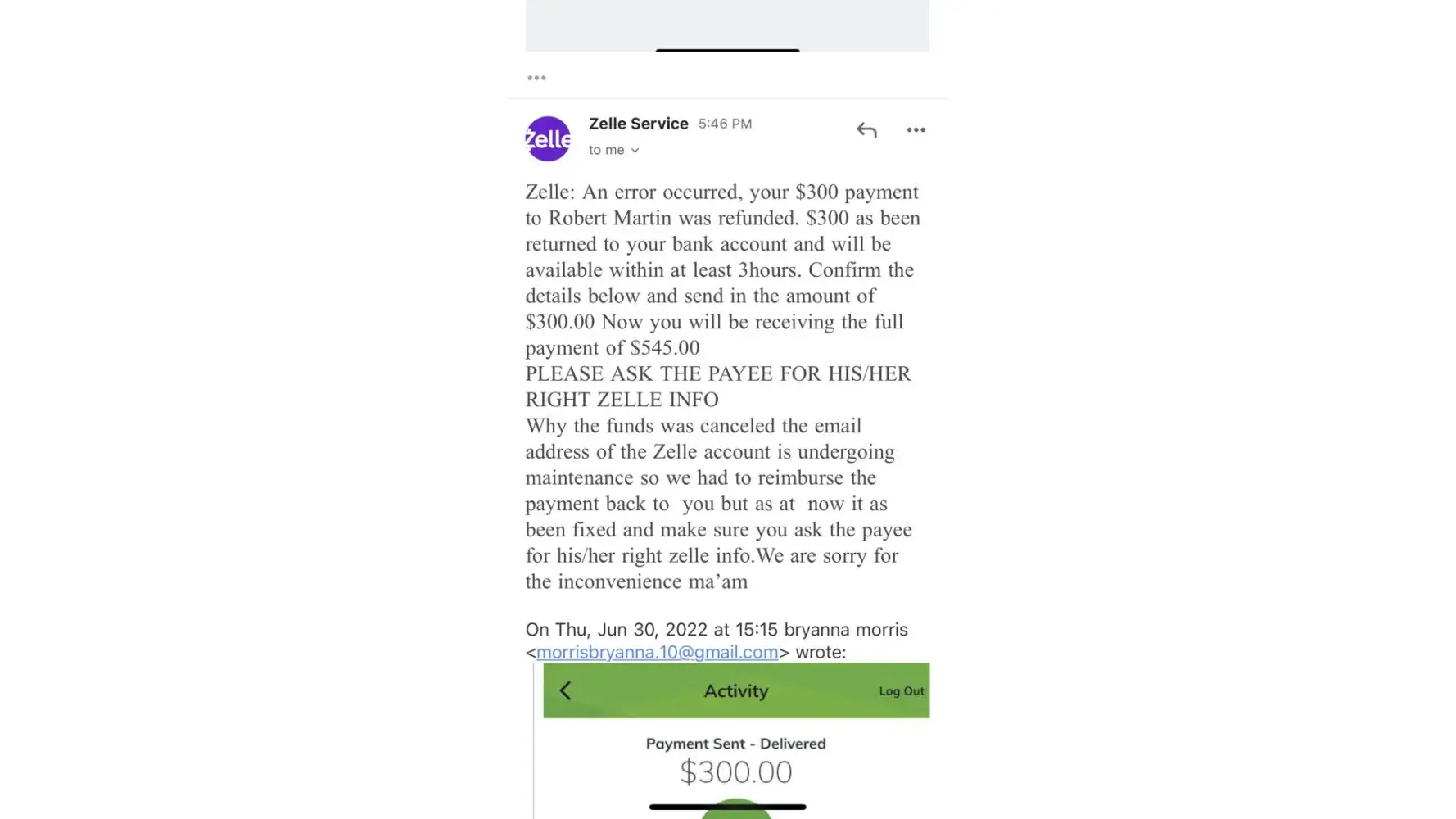 This incident had occurred on June 30th between 2:30pm and 6:30pm. I had lash extensions posted on facebook marketplace for about a month. Someone had messaged me from marketplace wanting to purchase them for $245.00 the listing price. She stated she lived in Boardman where I lived, but she did not have that information. She sent me $245 through Zelle under a business transaction. After that payment she sent me there was an email sent through zelle customer service stated my account needed upgraded to a business account. That email stated the buyer would pay an extra 300.00 dollars to upgrade the account and then I would refund her the extra money back once the account was a business account. So she sent the money over, the next email stated that if I did not follow the next steps my account would be seized to the Federal Bureau of Investigation. So I sent her back her extra 300.00 dollars and later got an email that said she did not receive that money beings the account was under maintenance and that it would be seen back into my account within 3-4 hours. So once the account was finished under maintenance I resent that 300.00. I ended up not receiving any of my money back.