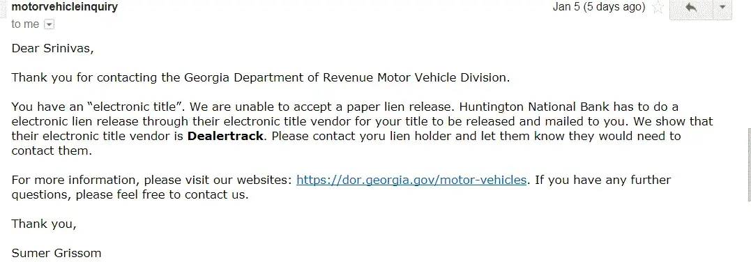 Since it is a electronic title Georgia tag office was unable to accept a paper Lien release. Please refer to the email note from Georgia tag office, also enclosing the emails communication for reference