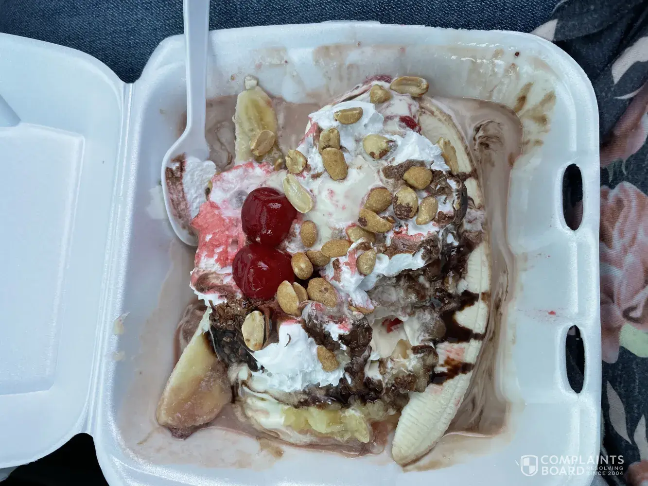 Ordered 2 banana splits to go. Ate at near by park. The sundae was placed in a styrofoam take out container, there was more water from the fruit on it and I could have drank it. The nuts were whole and no chocolate anywhere. It was a disgusting mess in which I threw it out as it was gross (see picture). This was my 5th try st getting a good order. Last time is was a cold nasty burger.