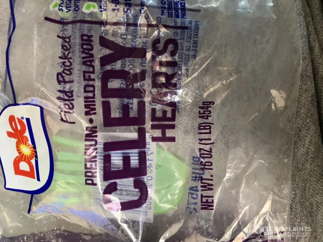 About 12-17-25 or so, at the Council Bluffs IA Hy-Vee #2 store, purchased 2 bags of Dole celery Hearts. When bags opened they had an excessive amount of dirt on them. Due to fresh food recalls across the nation due to food poisoning we threw them away. We didn’t think to take pictures of the 2 bags until we threw them away and they got mixed with coffee...