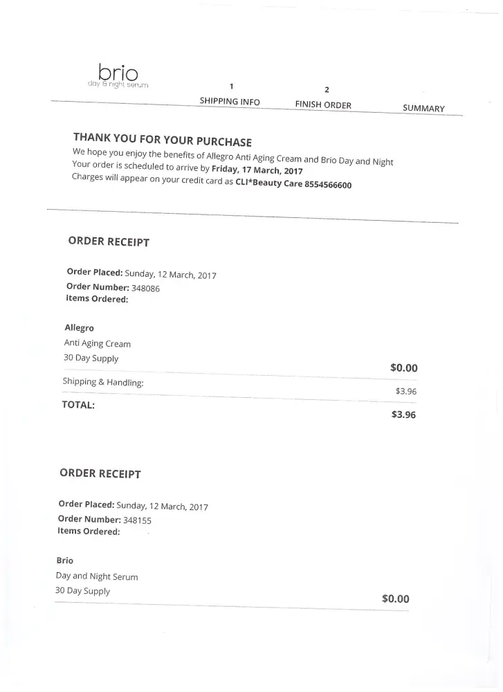 BEWARE! My complaint is the same as every other you will read! A trial order of Allegro (only) was placed online for $4.95. I also received a second package of something called Brio Day & Night Serum which I did not order, but was billed at $4.95. Before placing the Allegro order, I carefully read thru the "fine print" just to be sure I would not be on an auto-fill program after a trial period. Nothing! Realizing how many "scams" are out there regarding "Trial" products, and having fallen prey to one once before, I phoned Customer Service. I was advised by a rep with a very strong foreign accent that my "trial period would be extended for another 2 weeks to give me the opportunity to try the product further". Fast forward to near the end of the extension, I phoned Hydra Skin. I was SHOCKED to learn that $109 had been charged to my credit card for Brio Day & Night Serum. I never received that product -- no confirmation with the order number & tracking info -- nothing! But a $109 charge.