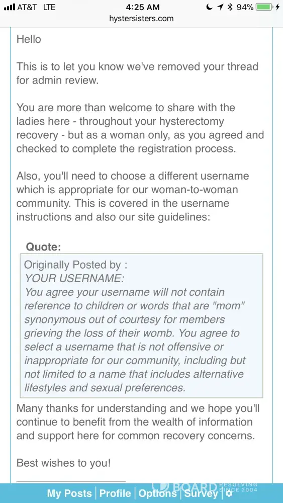 I agree the moderators are horrible people. I just had a huge major surgery and wanted to share my experience but because I’m transgender she said I was not welcome. I will create another site where all are welcome and put that bigoted site to rest. please see picture.