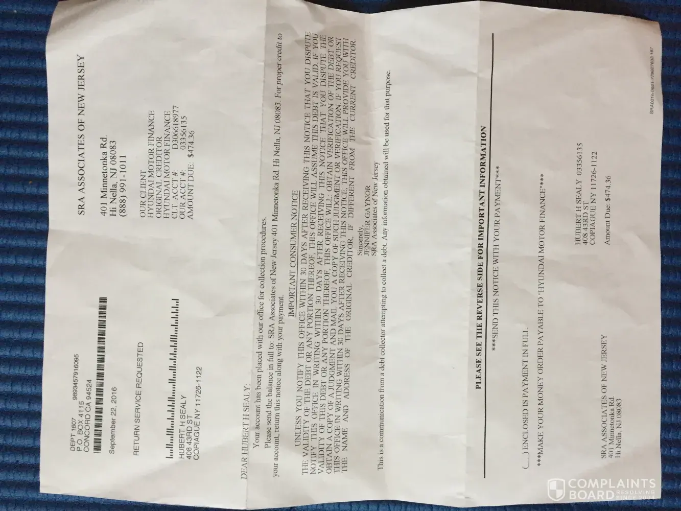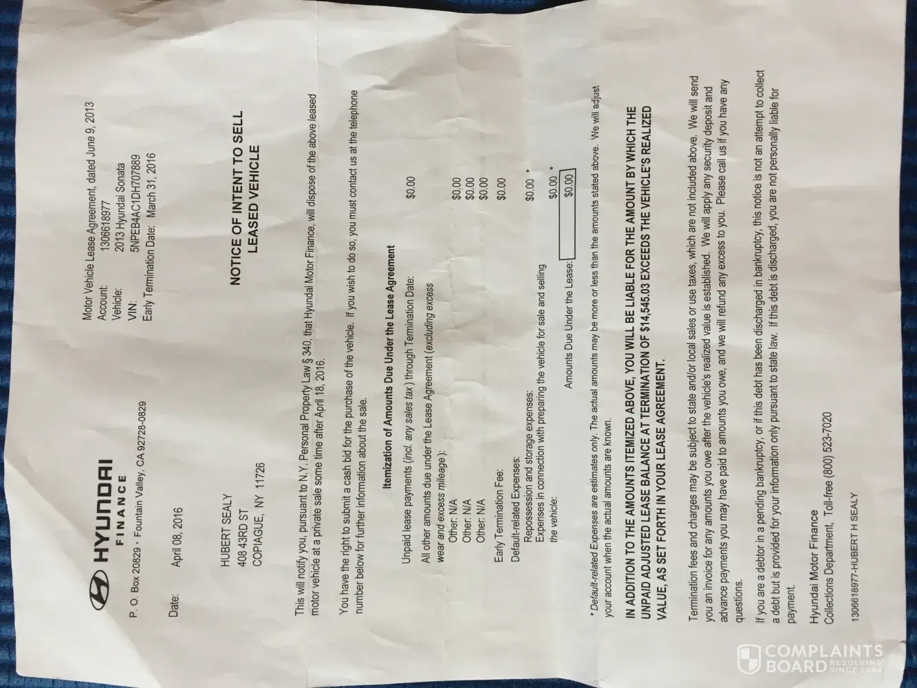 We just wanted to tell you how disappointed we are with what happened to us with the Hyundai Dealership at Atlantic Hyundai at West Islip, NY. We brought in our white Hyundai Sonata(VIN 5NPEB4AC1DH707889) last year March 31, 2016, during the march madness and we traded it in for a new lease. Our car was in mint condition, as always. Shortly after we received a letter saying we owed money and that the car had a dent in it and we were charged a fee. We texted Mr. Hudson Leogrande, which was our salesman, and told him that we received a letter saying we owed money because of remaining payments and damage to the car, he said would take care of it, because we made sure to pay what we were told and their was no damage to our car! Hubert went to the dealership and Jason Montolvo from financing told Hubert that something seemed wrong and that our money hadn't been applied correctly. So he needed time to look into it. Hubert went back again and was told their was damage to the car. Hubert told him that was not true! We are sure that our salesman Mr. Hudson Leogrande can attest that their was no damage, because he is the one who inspected it when trading it in. Mr. Jason Montolvo told Hubert, "Can you prove that you didn't dent the car?" WHAT?! Seriously! We have been loyal Hyundai customers since 2011. We wrote out a check that night when we leased our new car and that was supposed to cover any remaining payments and they know very well there was no damage to the car!They are covering up that some one on their own staff probably did damage to the car and we had to pay for it. Mr. Jason Montolvo, is telling us to prove we didn't damage the car. This is a nightmare and a horrible experience! Mr. Hudson Leogrande can vouch for us and can he prove that someone else didn't do it and I, Michelle Dallaris am a witness also! Please help us. We are waiting for ch. 7 news-Seven on your side, to get back to us and if that doesn't work we will be contacting our lawyer. Our credit was really messed up because Hyundai took us to collections when we thought Atlantic dealership was in the midst of clearing things up for us. Not one person has tried to make right by us and that is really disappointing. We are reaching out trying to get some justice. I will wait before writing a bad review about Atlantic Hyundai, with the hopes that you will try to help us. Unfortunately, we paid a settlement of $379.49. We want our record to be cleared with the credit bureaus. We are requesting that a letter of explanation be sent stating that there was an error and that we should never have been taken to collections. Thank you in advance for your cooperation.