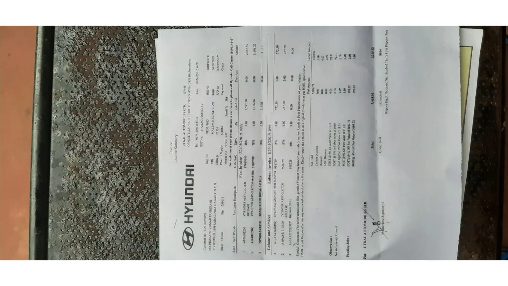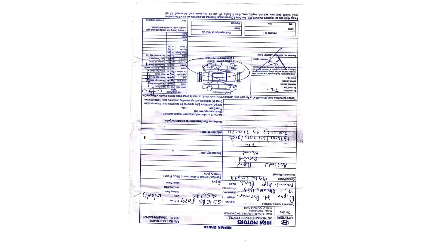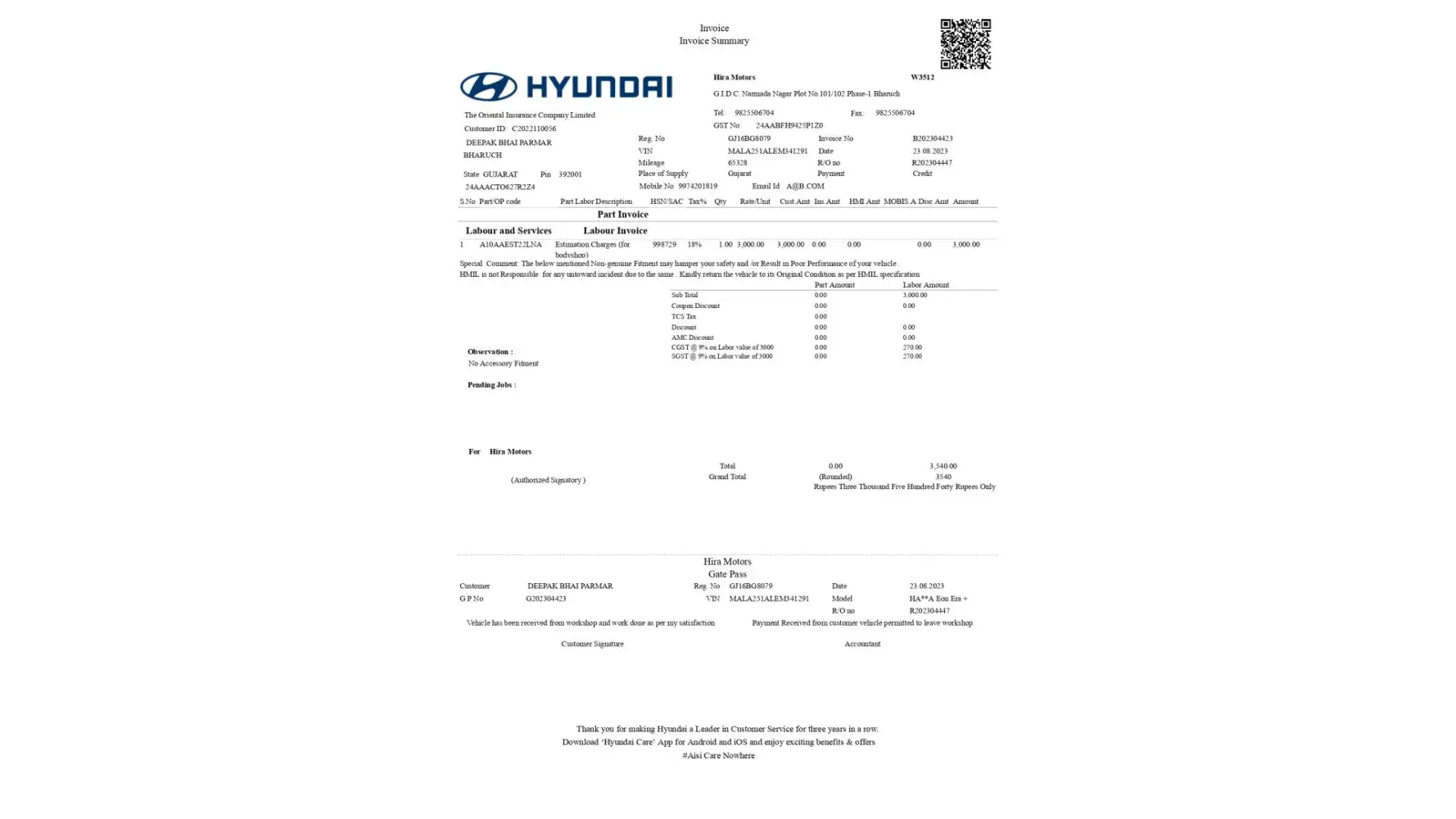 This to information you that the I have eon car GJ-16-BG-8079 and recent the car is accident in Bharuch city, The car is repairing to the respondent Hyundai Show Room Hira Motor , The bill issued by Hira Motor is not legitimate