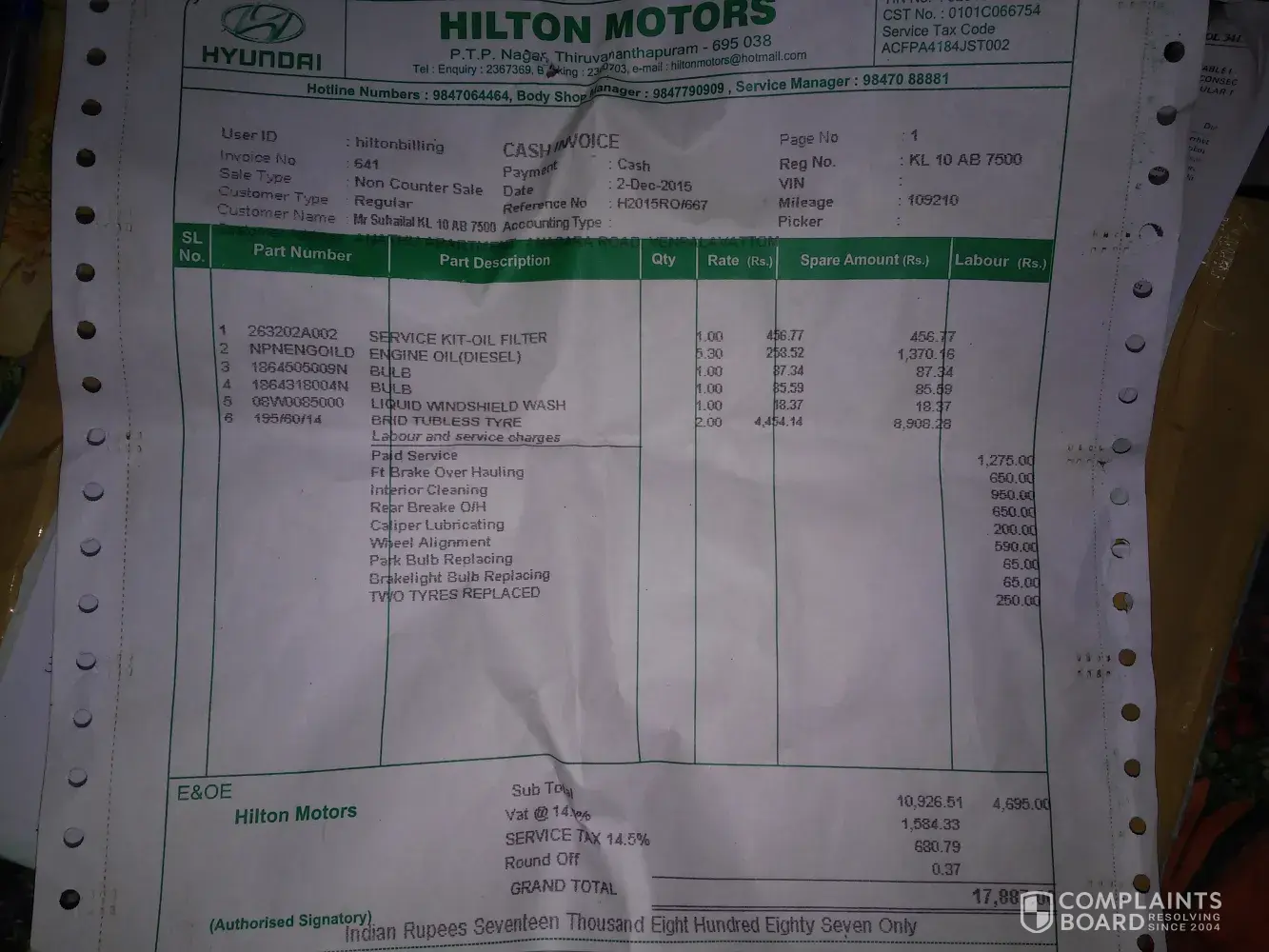 I am Dr.suhail P.T, senior registrar in cardiology working in KIMS hospital Trivandrum. I have given my Hyundai verna KL10AB7500 for regular service at hiltonhyundai authorized service center on 01/12/2015. I also instructed to change my two front tyres with new BRIDGESTONE tyres. I received the car on 02/1202015- ref no:H2015RO/667. They put two BRIDGESTONE tyres, part no: 195/60/14. Each tyre costing RS.4454.4, RS.250 for replacing service and RS.590 for the wheel alignment.total bill costed RS.17887, INCLUDING the taxes. But after 50 days, while I was rushing to attend an emergency case, driving through the heavy traffic kollam-ernamkulum high way (to the kottiyam KIMS hospital), my right front tyre got broken . It was extreme god's grace that I escaped from an accident. With great difficulty I got a mechanic in to the place and the tyre was taken to the nearest tyre dealer and service center. It was found that the tyre which was replaced from hiltonhyundai, Trivandrum was 10 year old (manufactured on 21st week of 2006). I couldnot attend the case in the hospital on time. Realising that I was totally cheated by an authorized dealer, whom I trusted the most; and the frightening experience of narrow escape from an accident shocked my mind. I am totally upset, cannot concentrate on my duties for the last two days. As a cardiologist, who need at most concentration for the patient care; I am depressed. On 22nd/01/2016, today, after taking leave with loss of pay, I took my vehicle to the hiltonhyundai center in Trivandrum. I have given the complaint in letter. But the response was pathetic. They took it very lightly that even after explaining the problems, agonies they did not respond in responsible manner. Initially they were blaming BRIDGESTONE; then they told no new tyre is available and the general manager and the managing director is out of place (though after sometime they took the broken tyre to managing director's house which was nearby- but they did not allow me to meet him, nor he came to the office to discuss the case). Keeping 10 year old tyre in store itself is an offence. Cheating the customer who trusted an authorized dealer and a well reputed company like BRIDGESTONE; and not even hearing to the complaints (even after knowing that my life was endangered due to their cheating); is a criminal offence. I request you to take (1) Necessary actions so that nobody in the future will have such an insult and calamity (2) To get the tyres replaced with new BRIDGESTONE tyres with proper wheel alignments (3) To get me the necessary compensation (for the financial loss, leaves with loss of pay I have taken, mental agony I am going through still now, the insult I had from your service centre even after giving the complaint, for not valuing human life and doing things which may endanger others life just for money). If I don't get a satisfactory reply or necessary actions within24 hours, I will be forced to take legal action against your company. Expecting your cooperation. Faithfully Dr.suhail p.t Mob:[protected] Email. pt.[protected]@gmail.com
