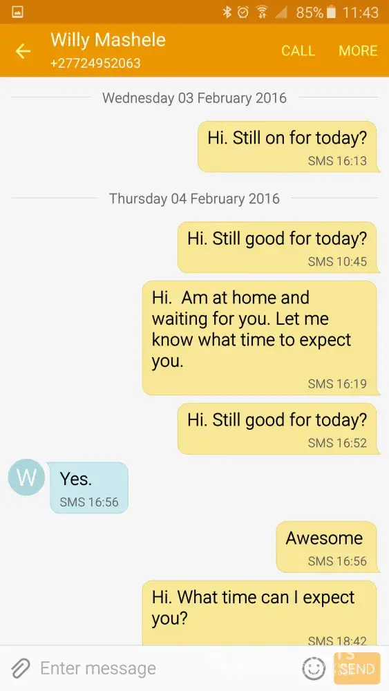 • On Tuesday 9th February 2016, I message him a few times with no response, and thereafter he does not answer my calls.