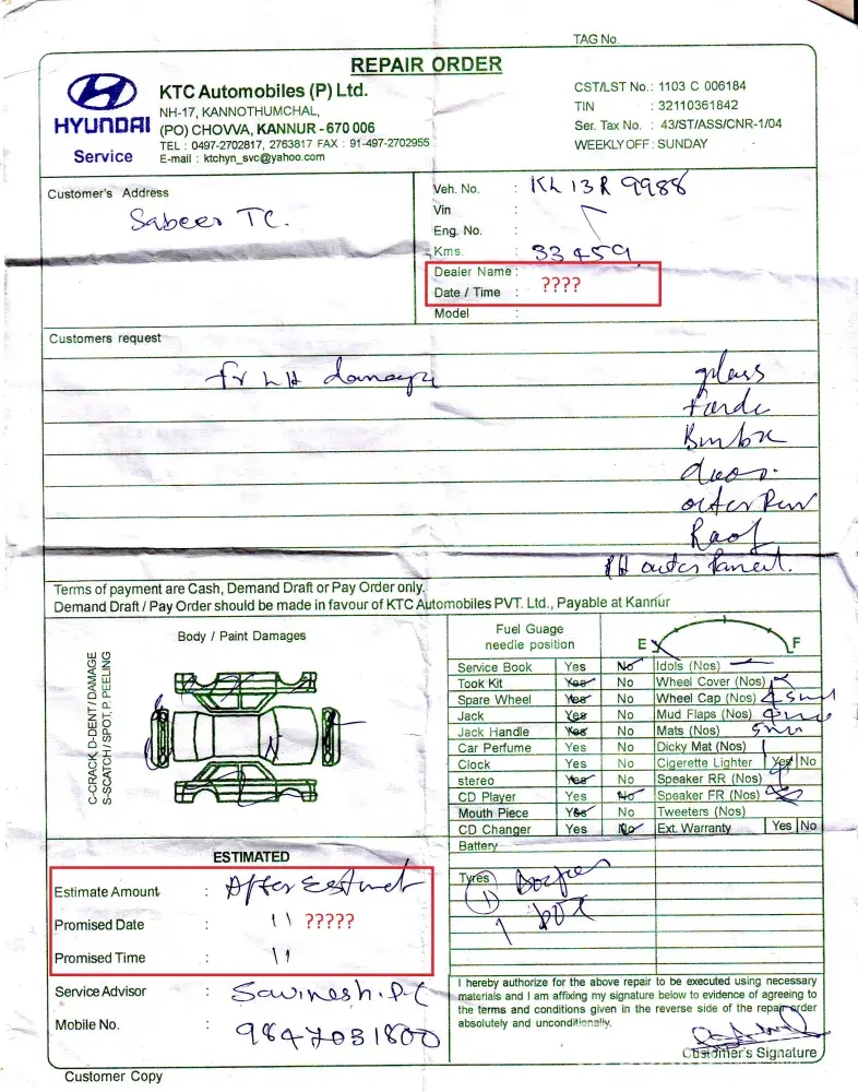 My car hyundai santro reg no KL-13 R-9988 got some damages( check the attached repair order copy to find the damages) because of an accident before two months . So my brother went to ktc hyundai, kannur to repair the car . but he faced very bad attitude from the ktc's staff. while the staff was preparing the repair order dint mentioned any dates like receiving or promised date. he asked about that but their reply was they cant mention any date even estimated amount also they told if you dont want you can take back your car. in that situation he really fed up with their attitude and he left the car there. but the thing is we never get car until this time. when we contact them they always giving only one answer that is if you want to repair you must wait until we get time to repair the car . and i realise that there is no other authorised service centre for hyundai in kannur, that is the only reason they behaving like this . so here i just submit my complaint for support from anybody to get my car back immediately . please not the service manners of ktc hyundai given below