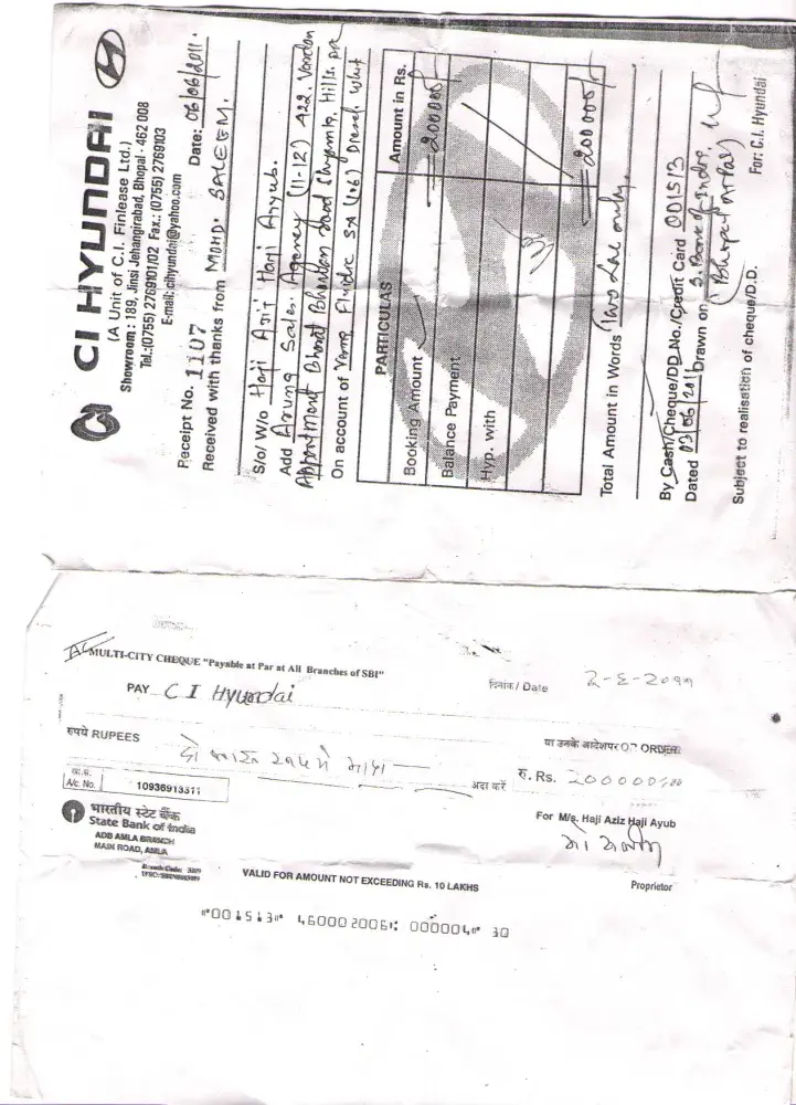 I wanted to say that I booked the car hyundai verna fludic, from ci hyundai, bhopal (m. p) before 2 months ago. and I give rs.200000 for the booking amount by cheque. now ci hyundai's vishal sexena (self manager) are not behaving right with us and not giving us "car". I attachated one copy of cheque and booking receipt. so I kindly request to you that plz take some action about them..